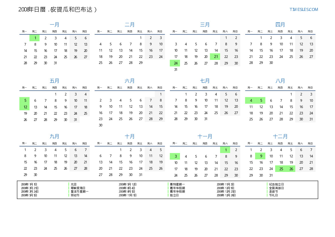 下載並打印2008年安提瓜和巴布达節假日和周末的PDF日曆