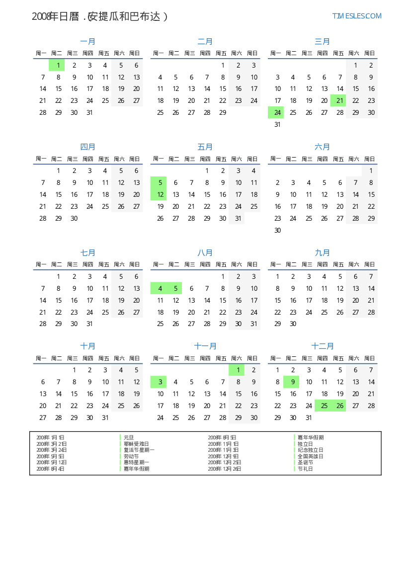 2008年安提瓜和巴布达日曆