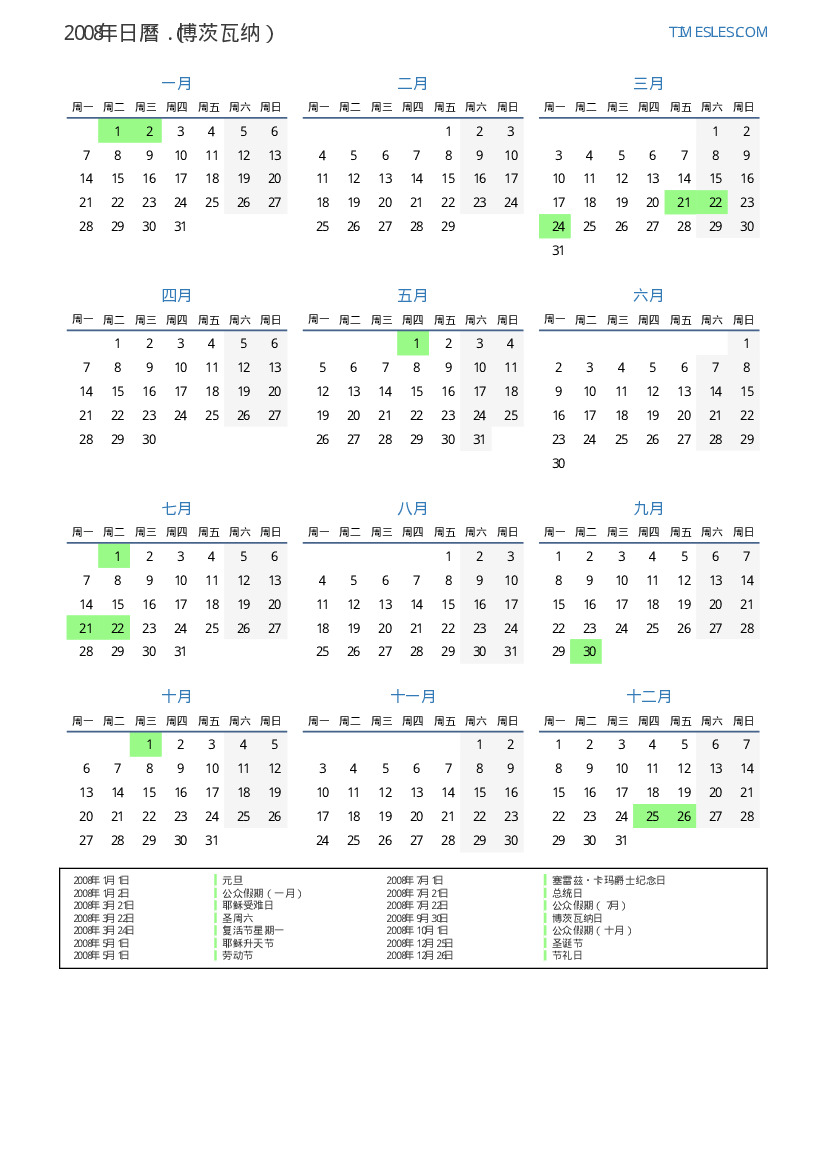 陽曆,閏年,一年366天。 在2008年,2008有20 假期和休假。 在中國東部的日曆上,2008年鼠年。 一年從星期二開始,到在星期三結束。
