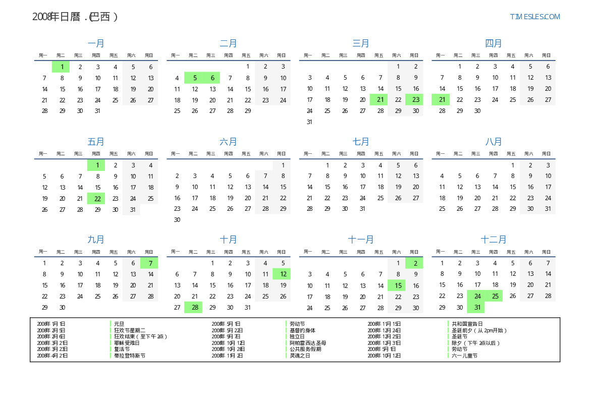 下載並打印2008年巴西節假日和周末的PDF日曆
