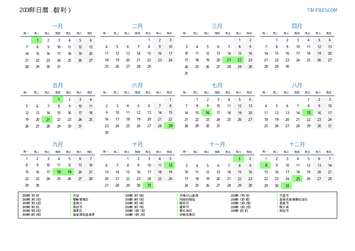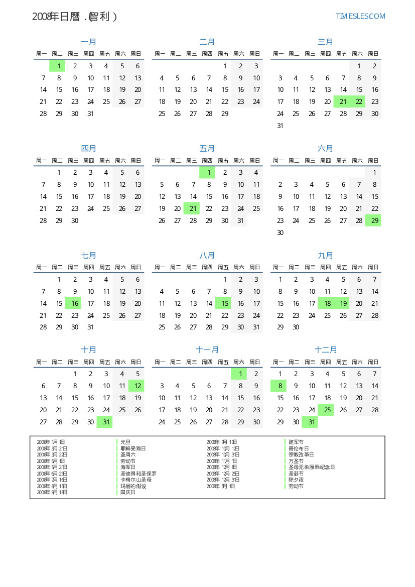 陽曆,閏年,一年366天。 在2008年,2008有24 假期和休假。 在中國東部的日曆上,2008年鼠年。 一年從星期二開始,到在星期三結束。