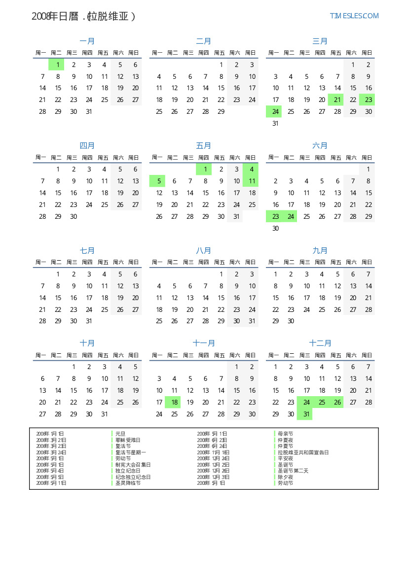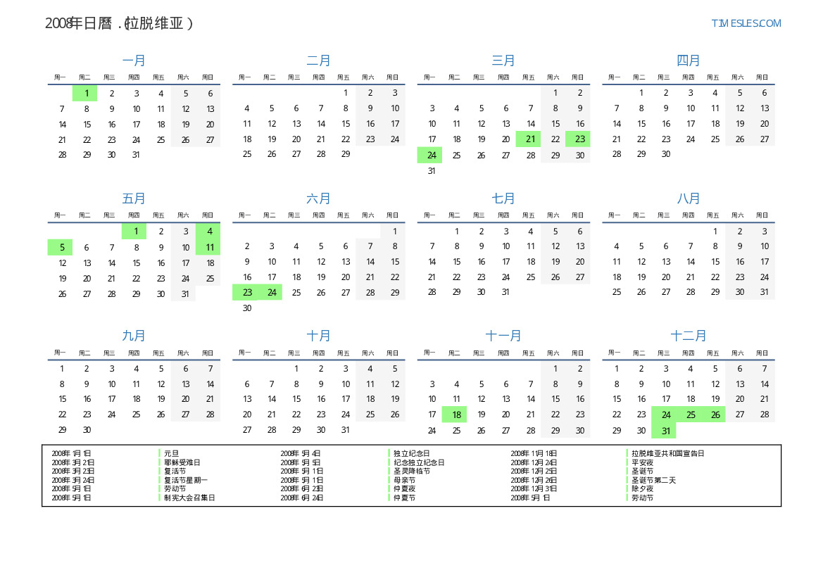 下載並打印2008年拉脱维亚節假日和周末的PDF日曆