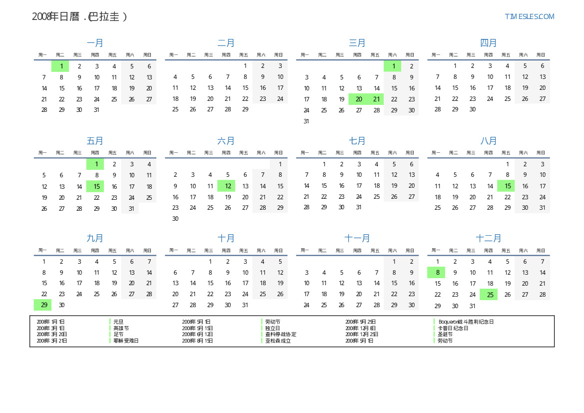 下載並打印2008年巴拉圭節假日和周末的PDF日曆