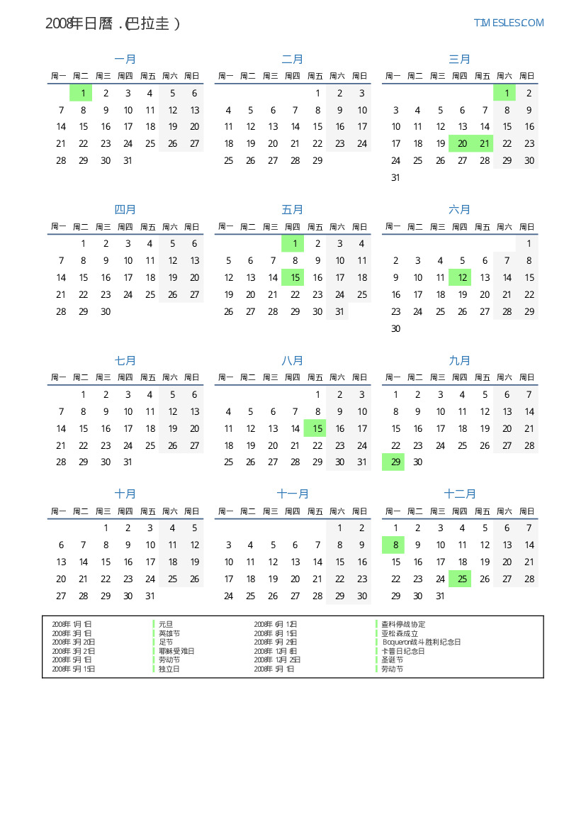 陽曆,閏年,一年366天。 在2008年,2008有18 假期和休假。 在中國東部的日曆上,2008年鼠年。 一年從星期二開始,到在星期三結束。