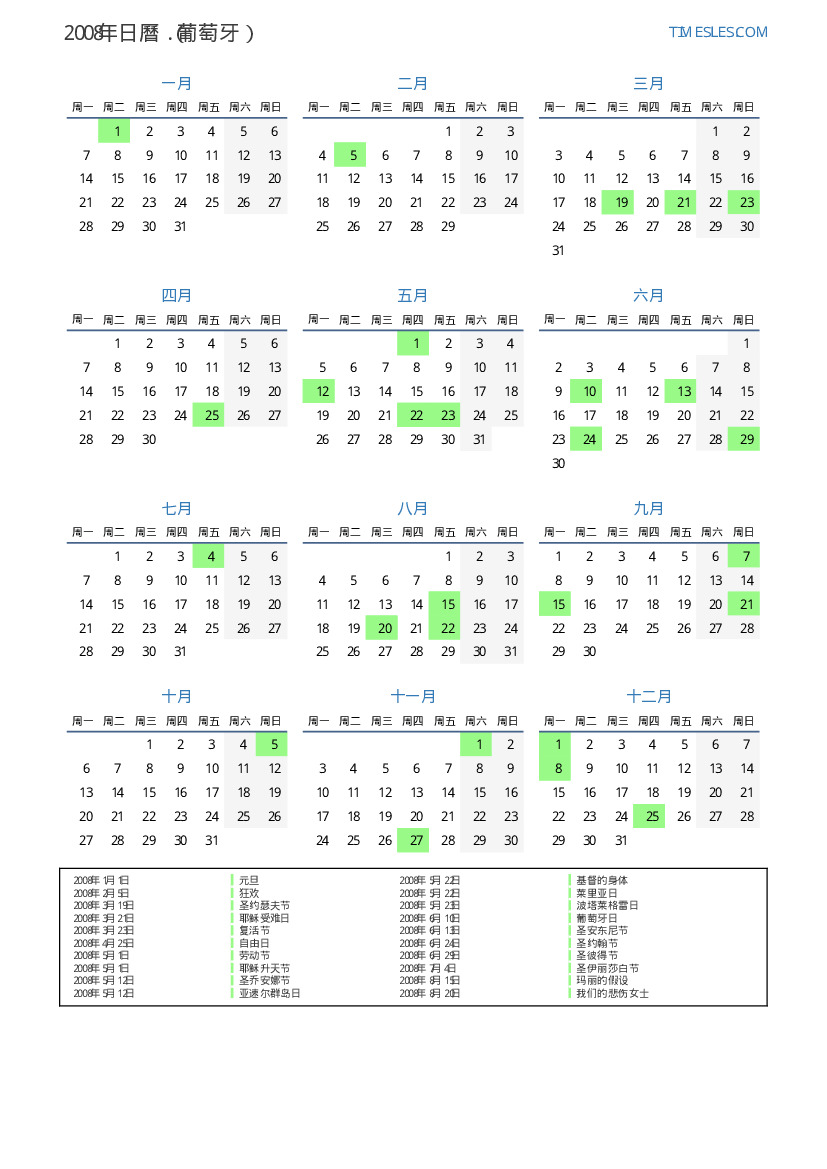 下載並打印2008年葡萄牙節假日和周末的PDF日曆