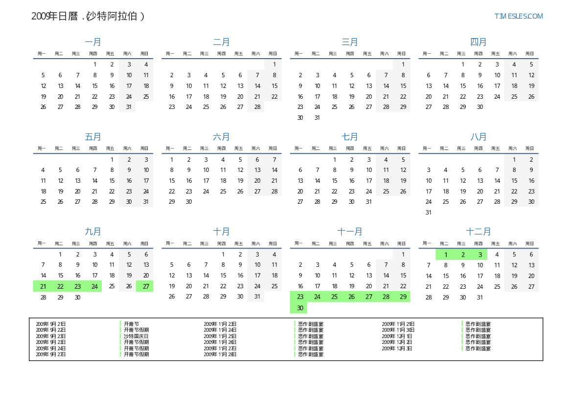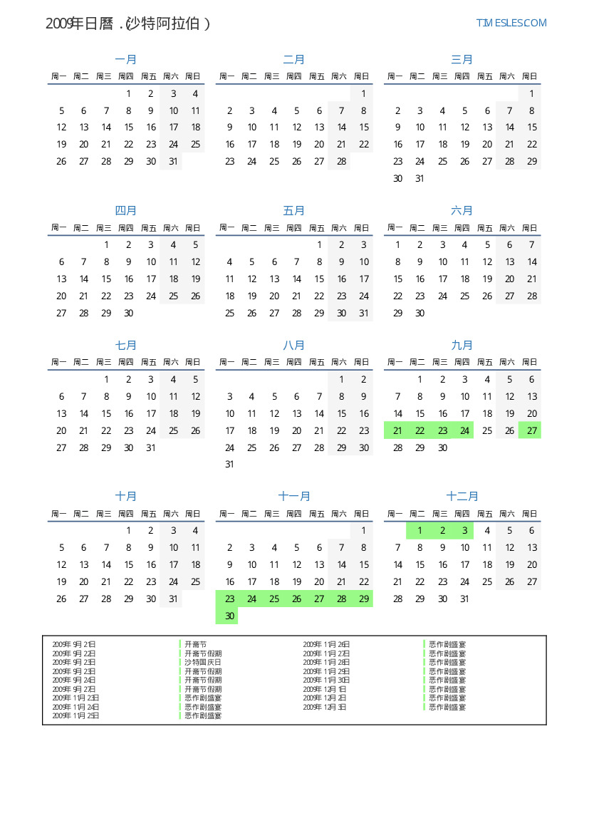 下載並打印2009年沙特阿拉伯節假日和周末的PDF日曆