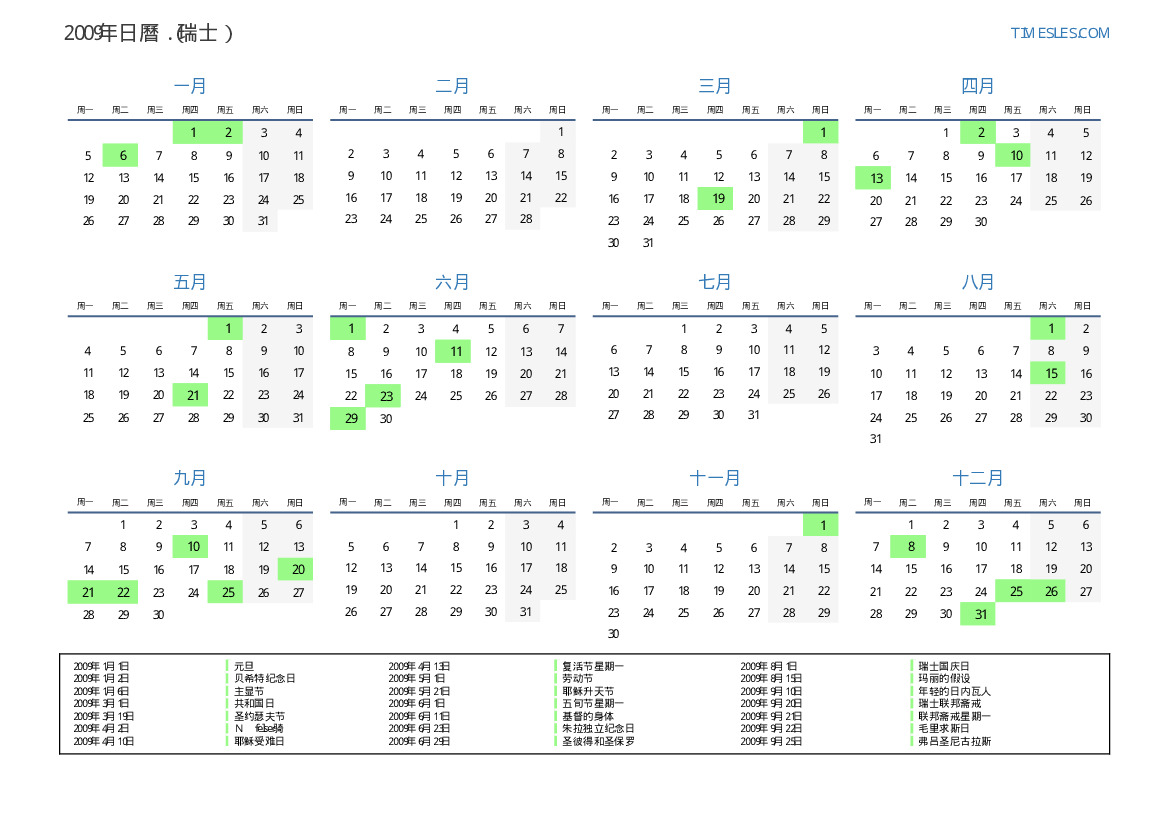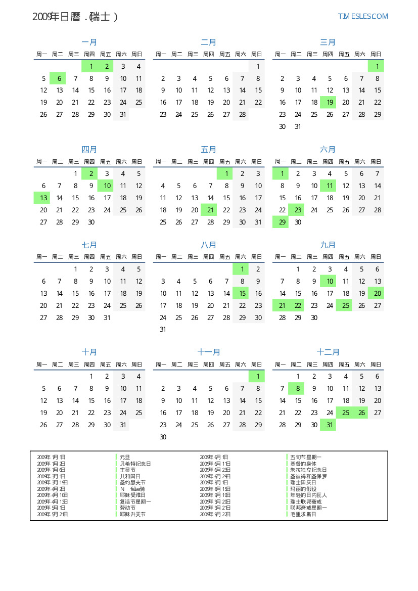 下載並打印2009年瑞士節假日和周末的PDF日曆