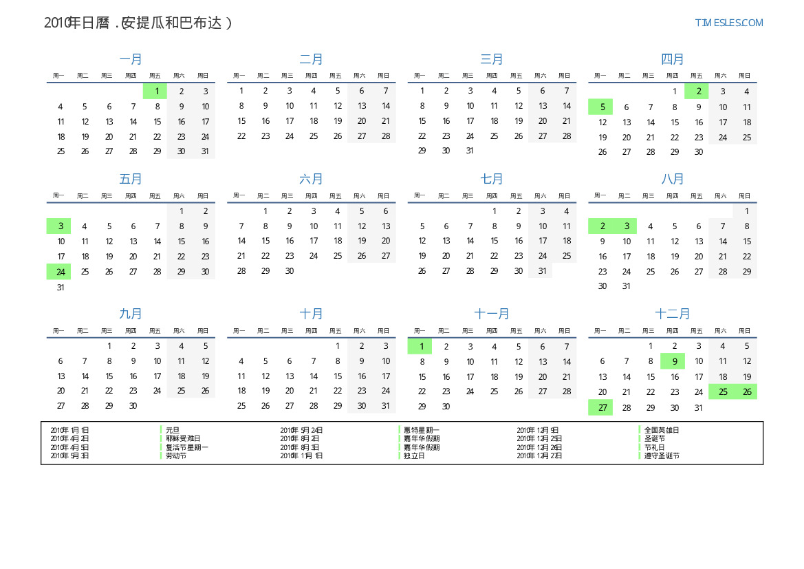 下載並打印2010年安提瓜和巴布达節假日和周末的PDF日曆