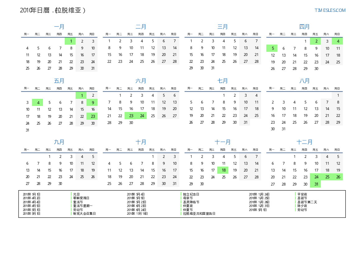 下載並打印2010年拉脱维亚節假日和周末的PDF日曆