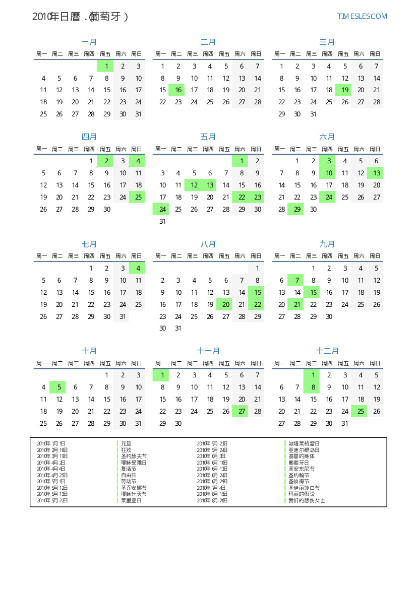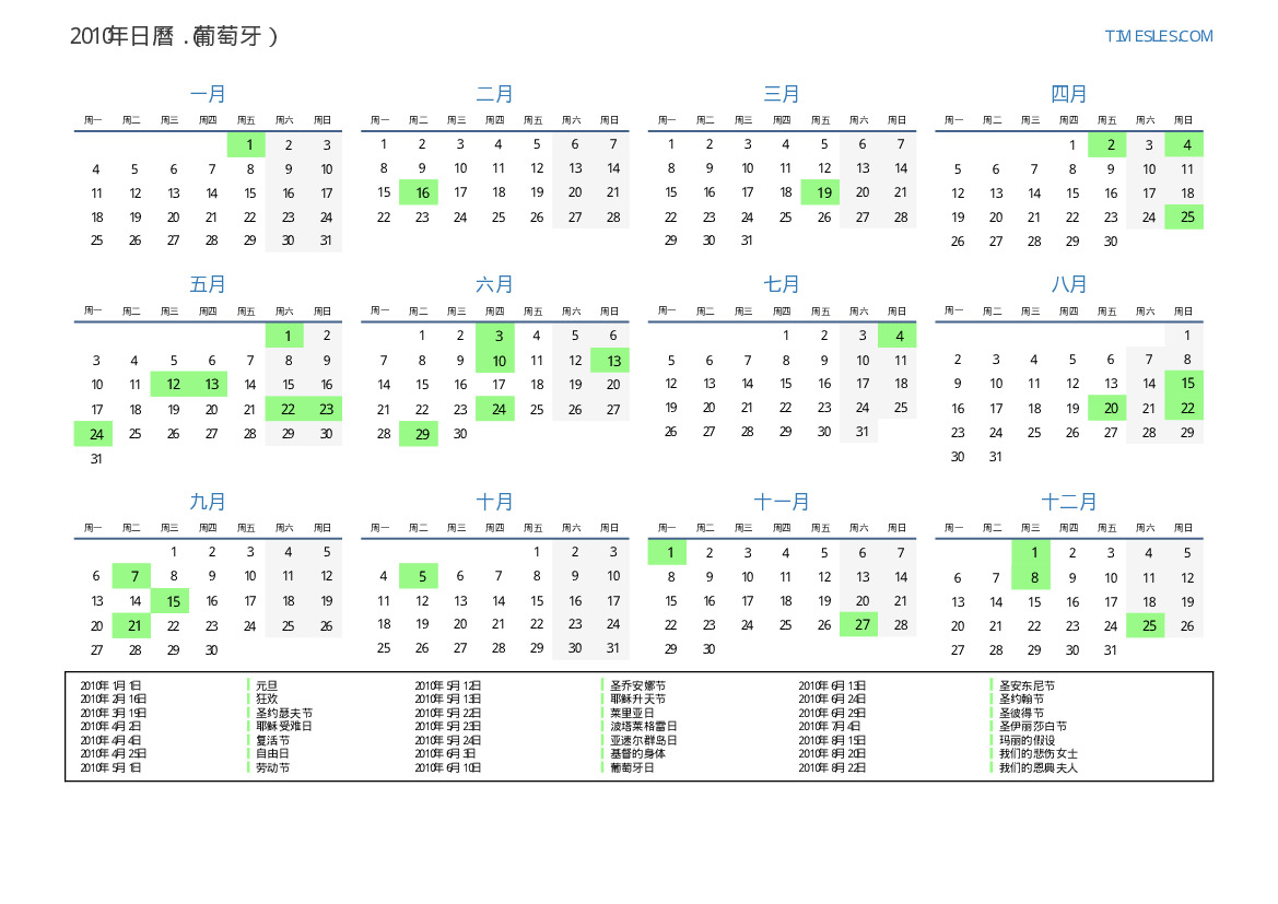 下載並打印2010年葡萄牙節假日和周末的PDF日曆