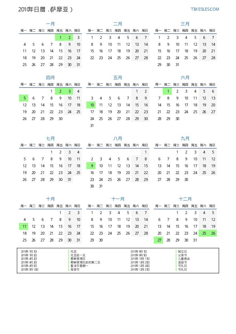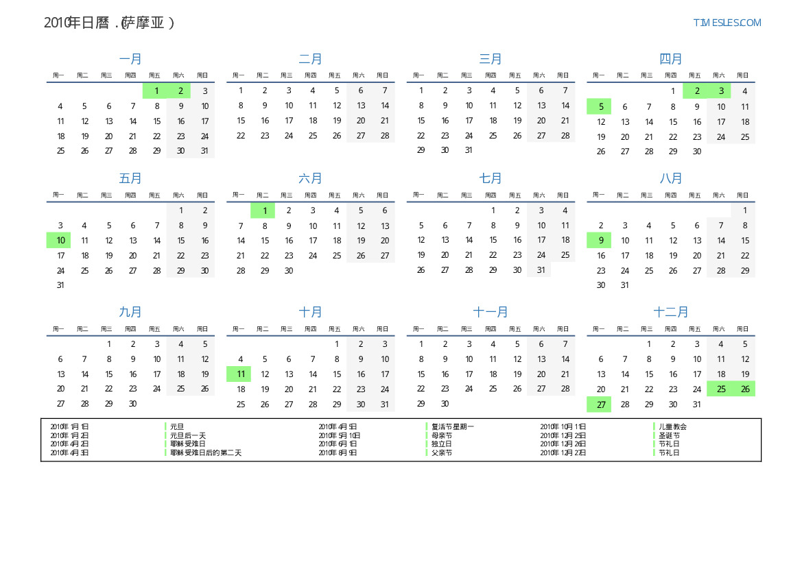 下載並打印2010年萨摩亚節假日和周末的PDF日曆