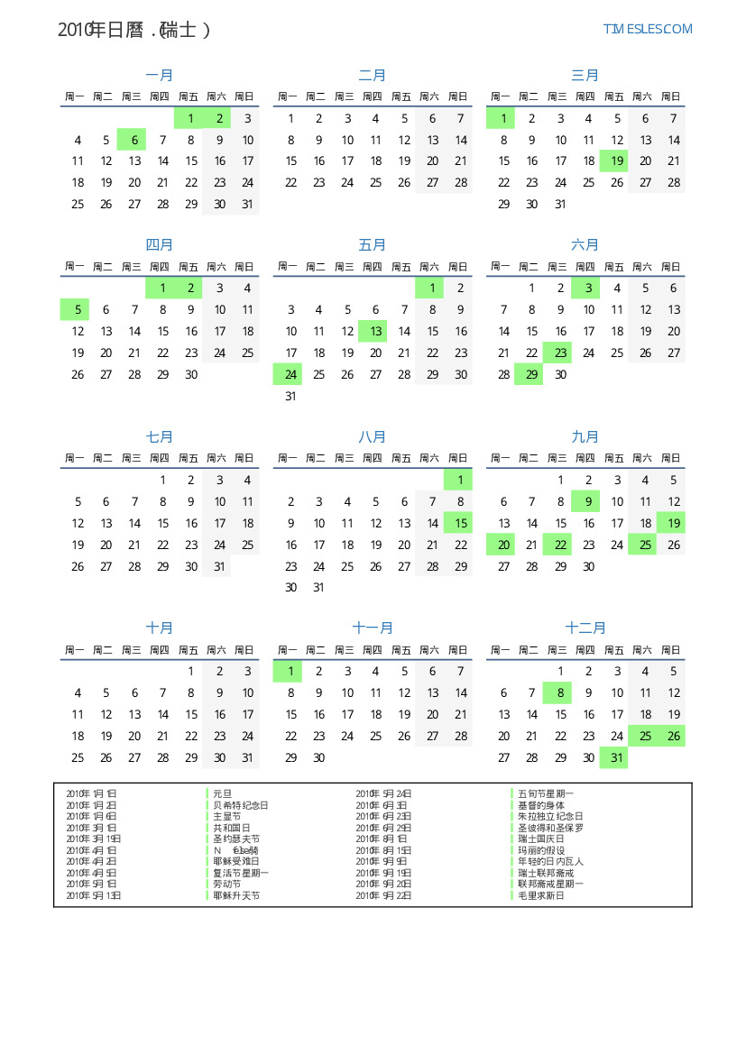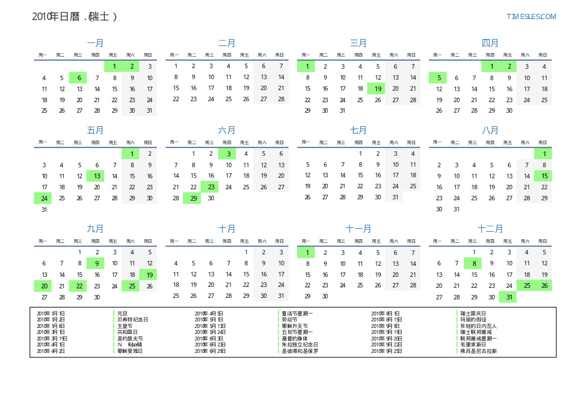 下載並打印2010年瑞士節假日和周末的PDF日曆
