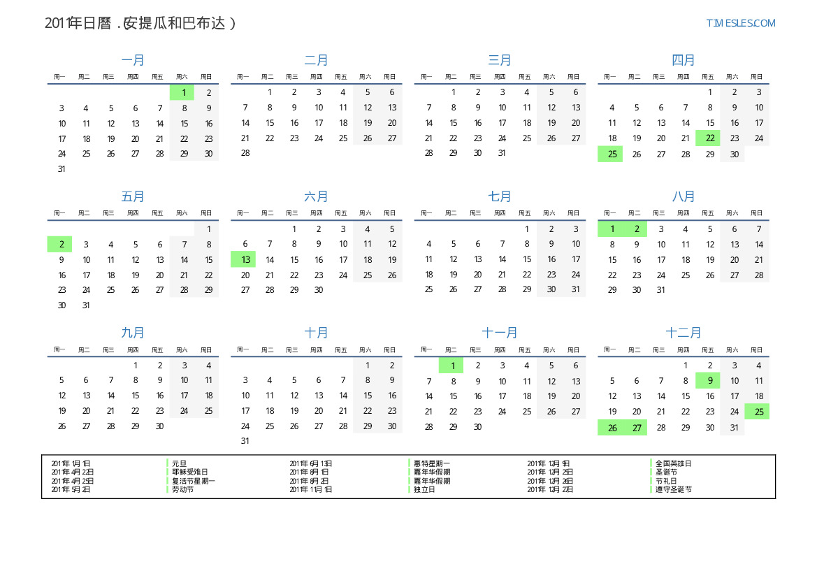 下載並打印2011年安提瓜和巴布达節假日和周末的PDF日曆