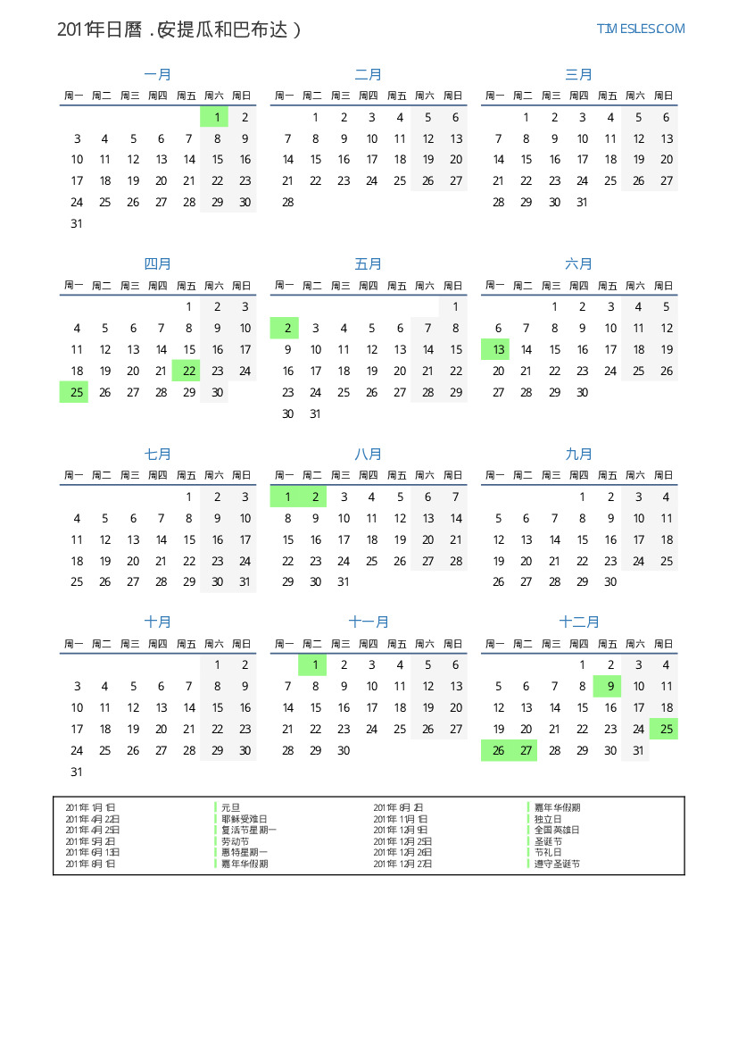 2011年安提瓜和巴布达日曆