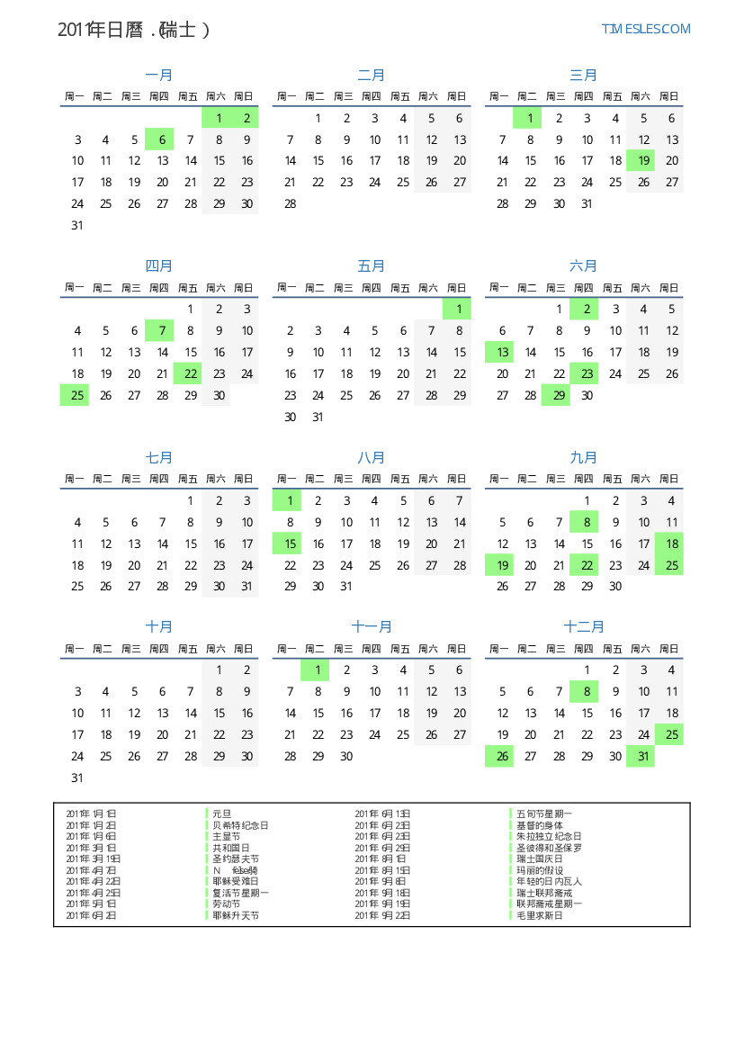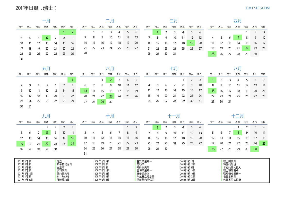 下載並打印2011年瑞士節假日和周末的PDF日曆