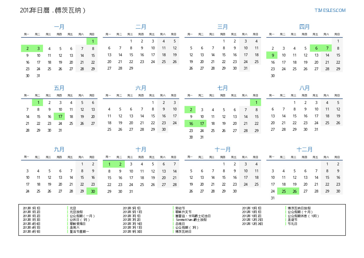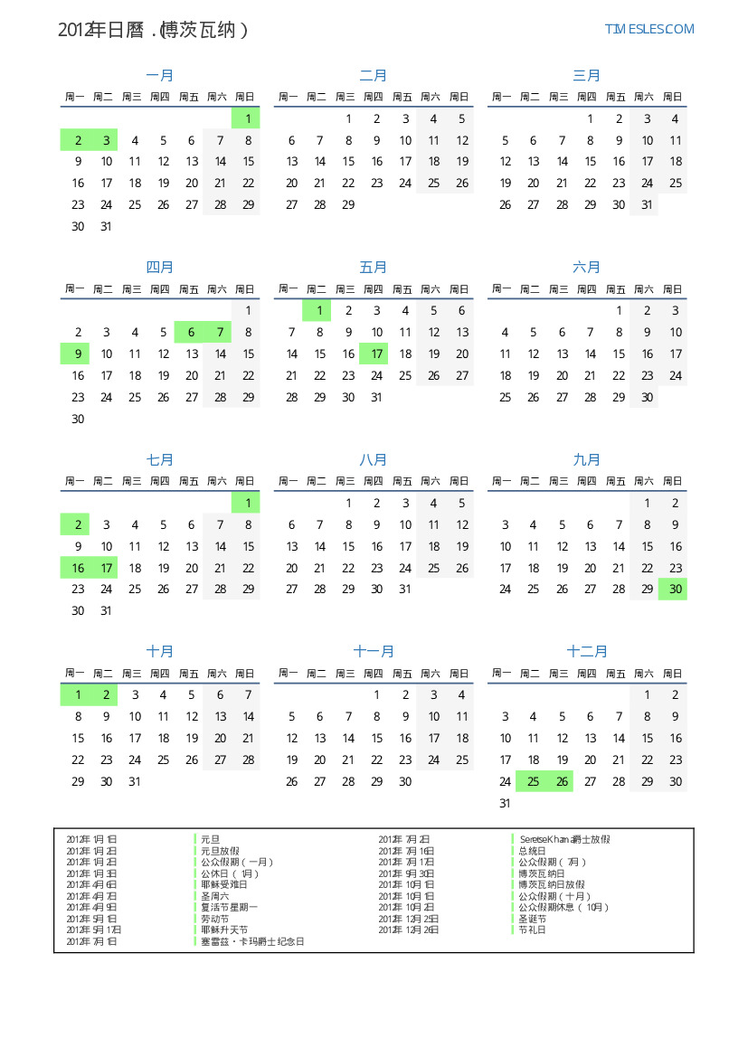 2012年博茨瓦纳日曆