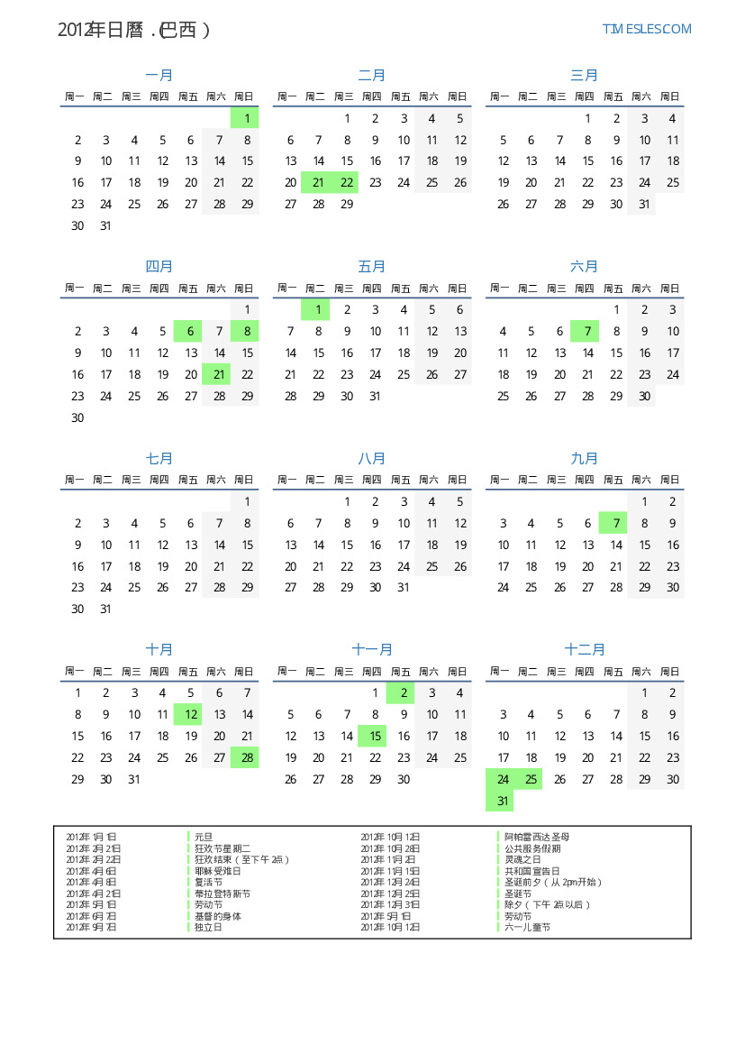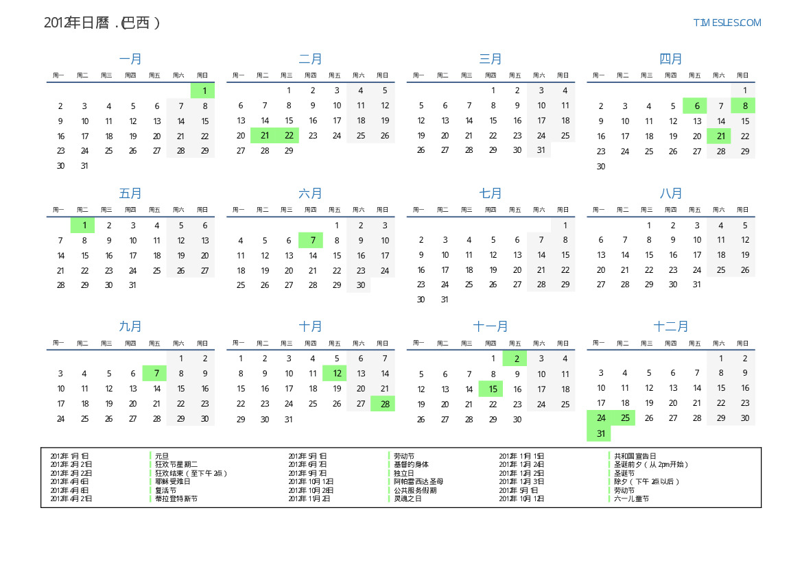 下載並打印2012年巴西節假日和周末的PDF日曆