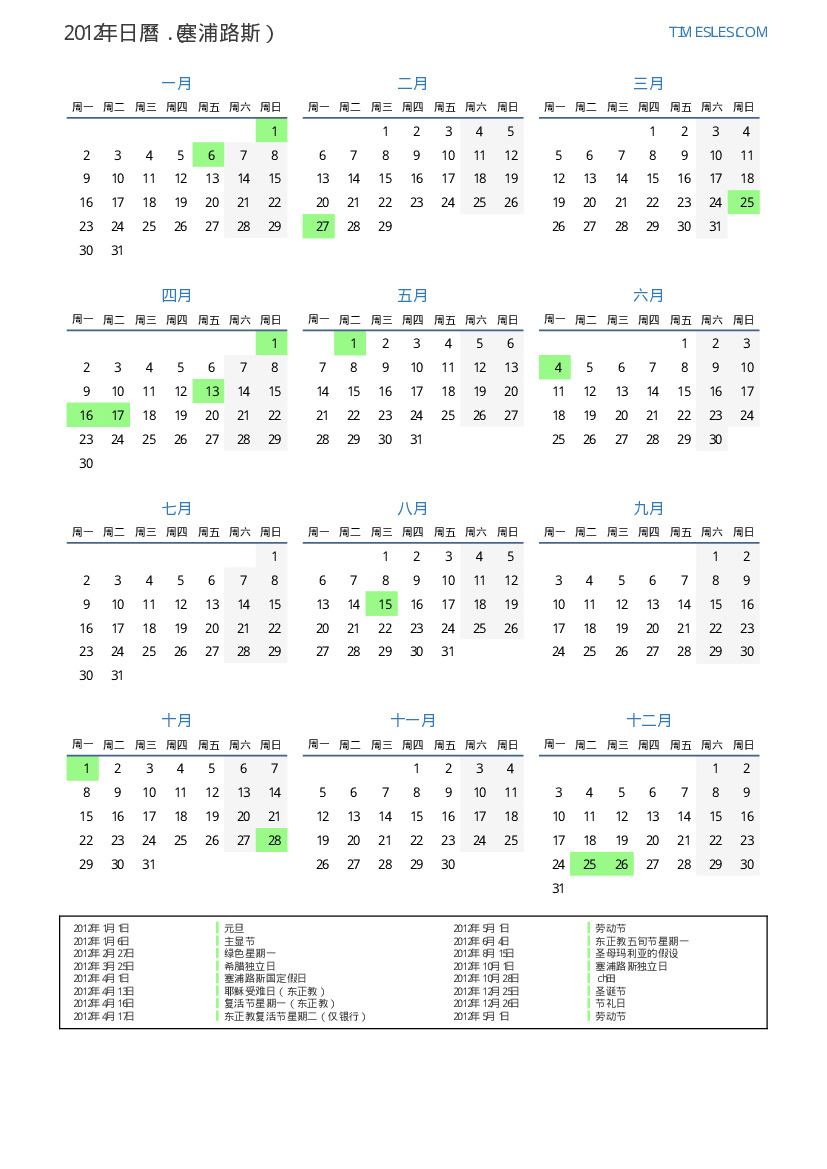 2012年塞浦路斯日曆