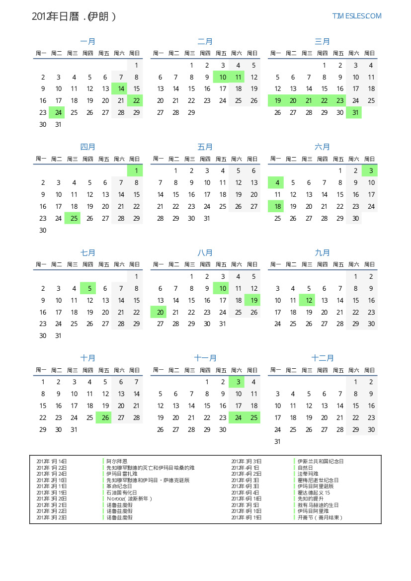盧薩伊朗的2012年假期和周末日曆