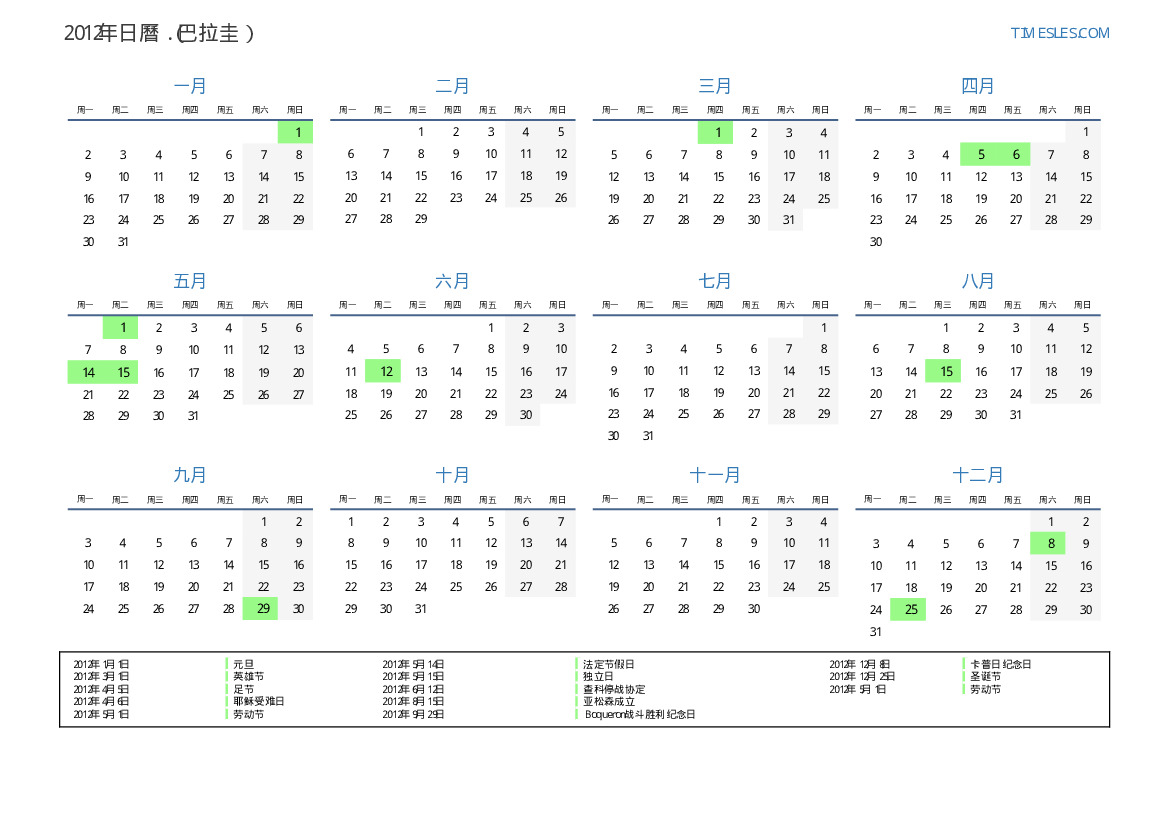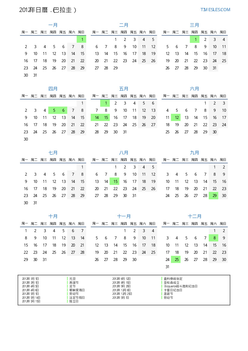 下載並打印2012年巴拉圭節假日和周末的PDF日曆
