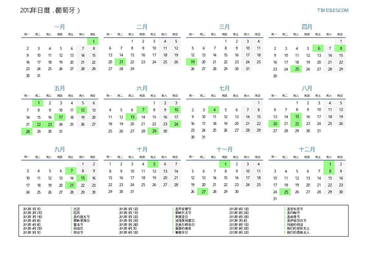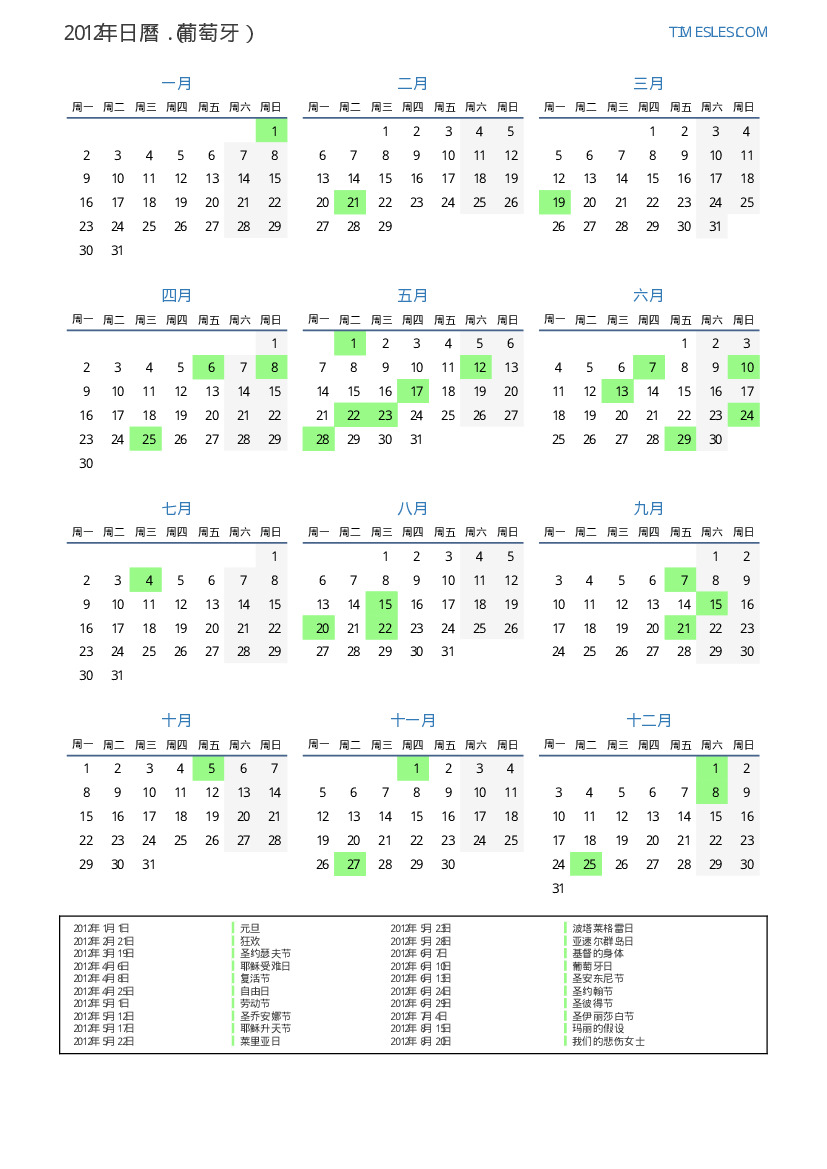 2012年葡萄牙日曆