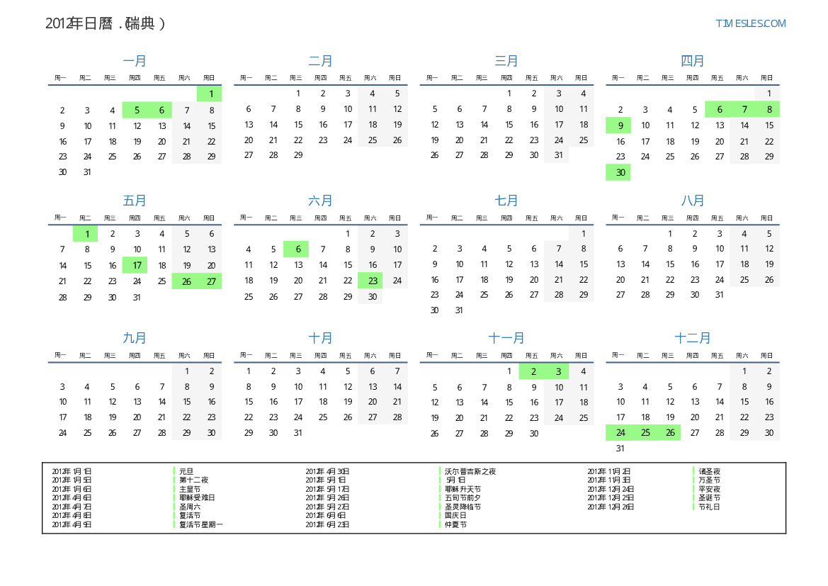 下載並打印2012年瑞典節假日和周末的PDF日曆