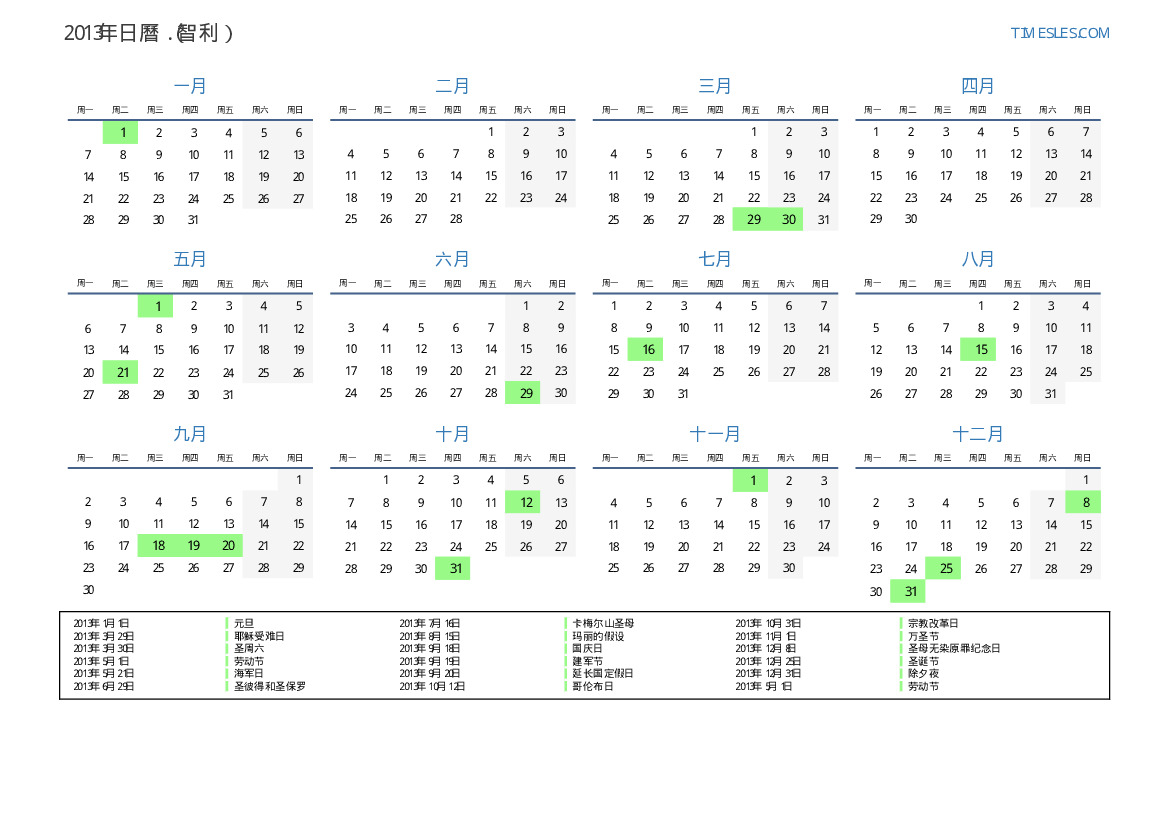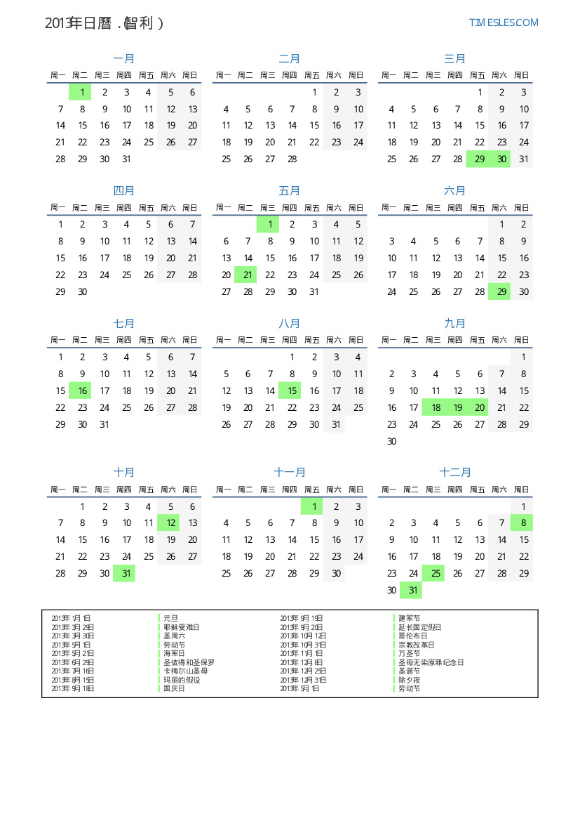 陽曆,不是飛躍年,一年365天。 在2013年,2013有25 假期和休假。 在中國東部的日曆上,2013年蛇年。 一年從星期二開始,到星期二結束。
