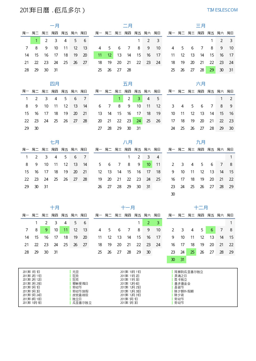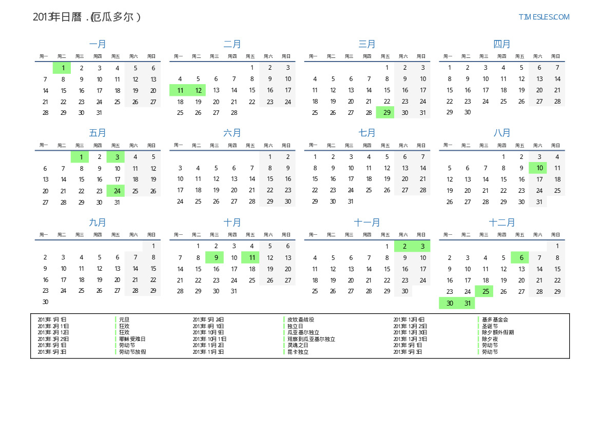 下載並打印2013年厄瓜多尔節假日和周末的PDF日曆