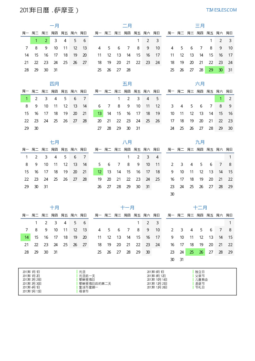 下載並打印2013年萨摩亚節假日和周末的PDF日曆