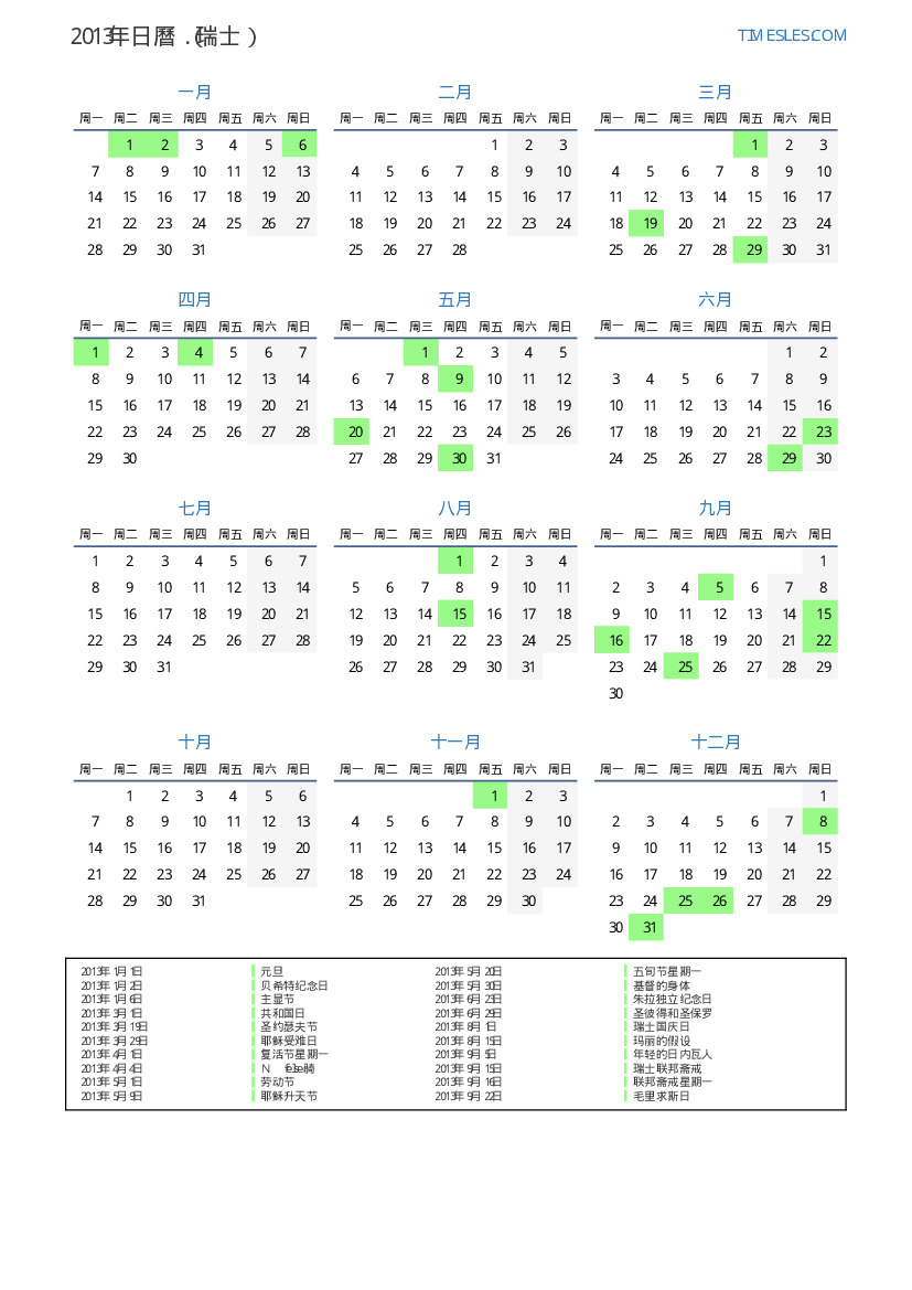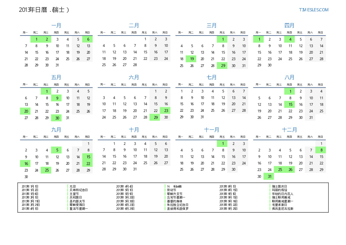 下載並打印2013年瑞士節假日和周末的PDF日曆