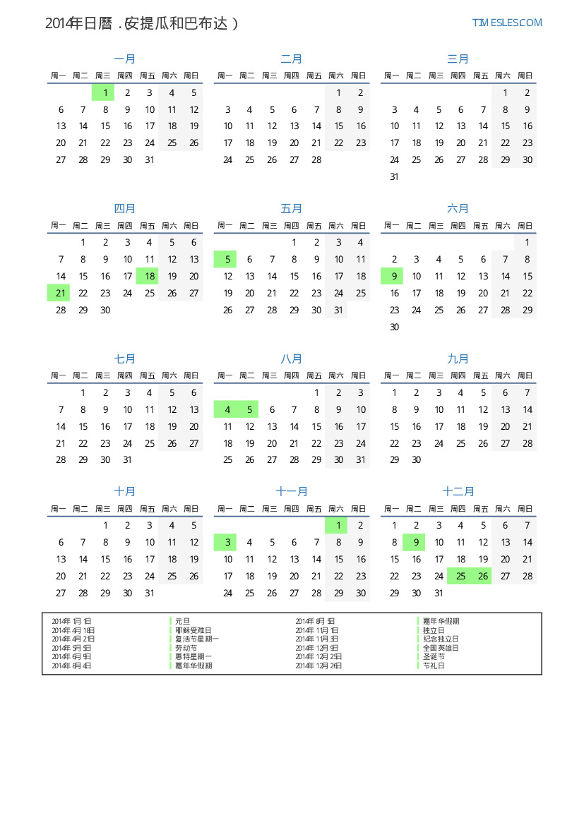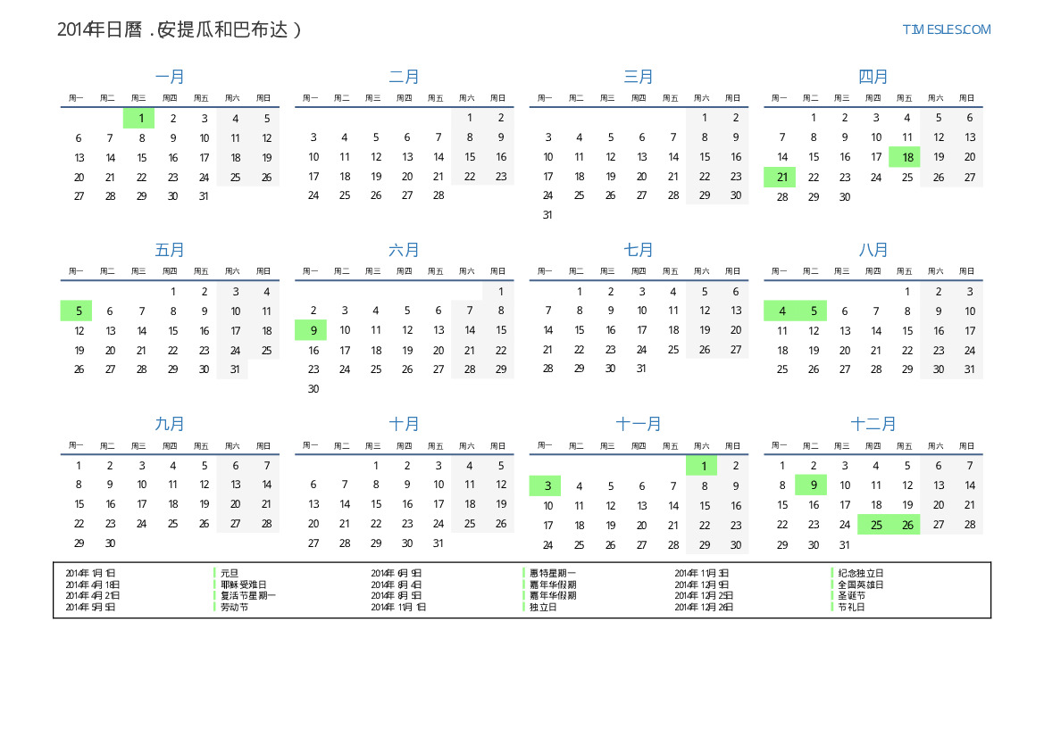 下載並打印2014年安提瓜和巴布达節假日和周末的PDF日曆