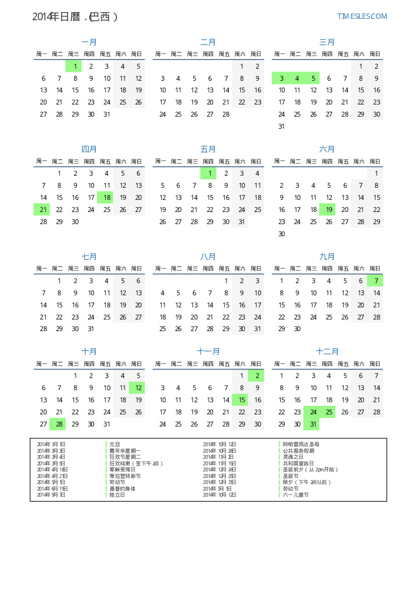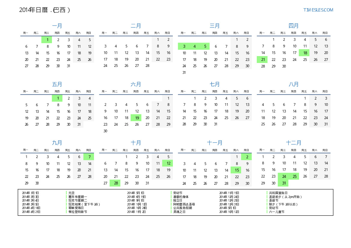 下載並打印2014年巴西節假日和周末的PDF日曆