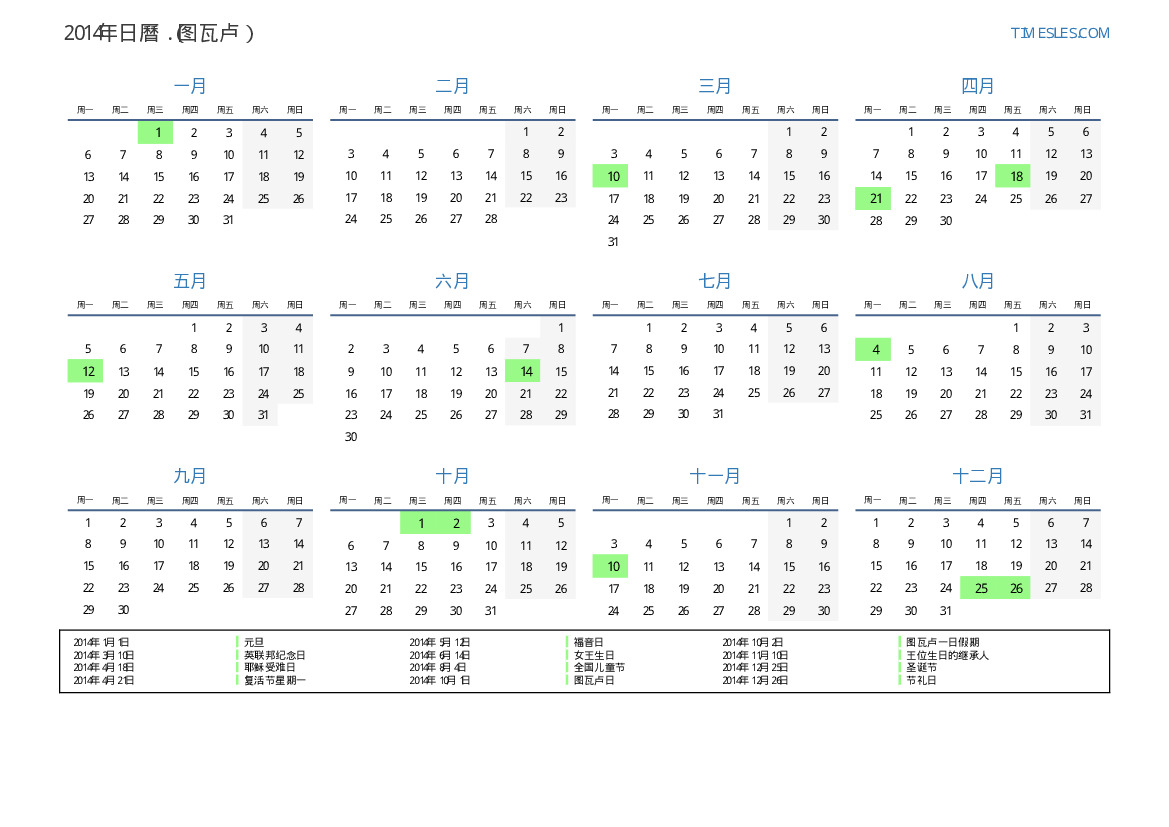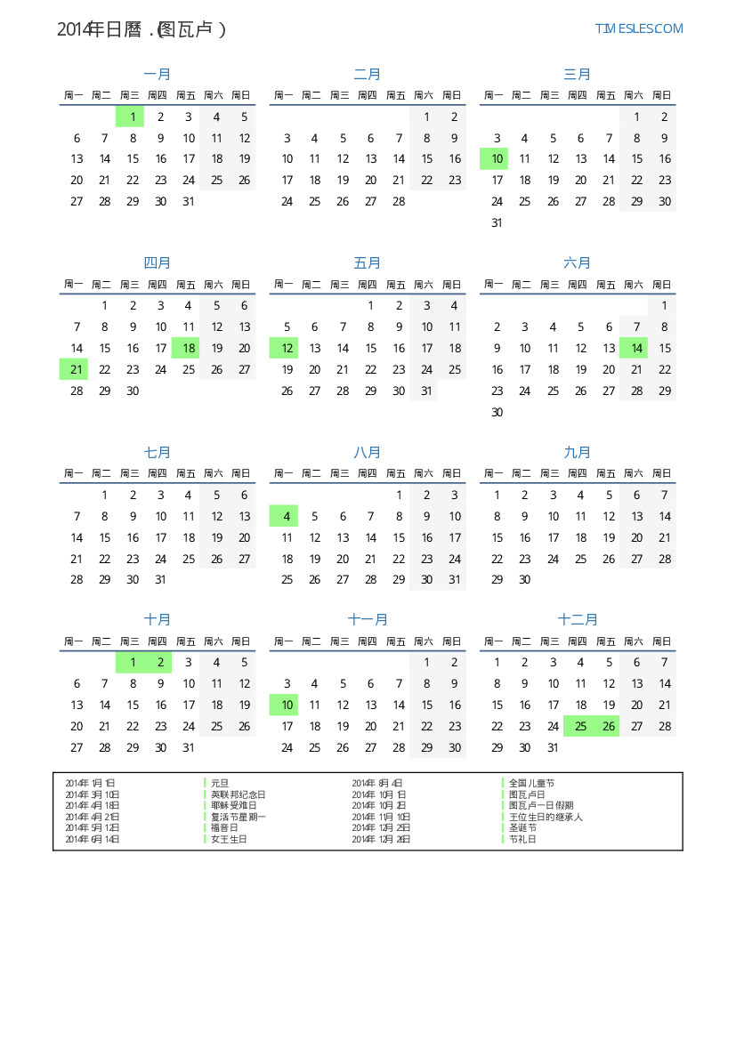 下載並打印2014年对于图瓦卢節假日和周末的PDF日曆
