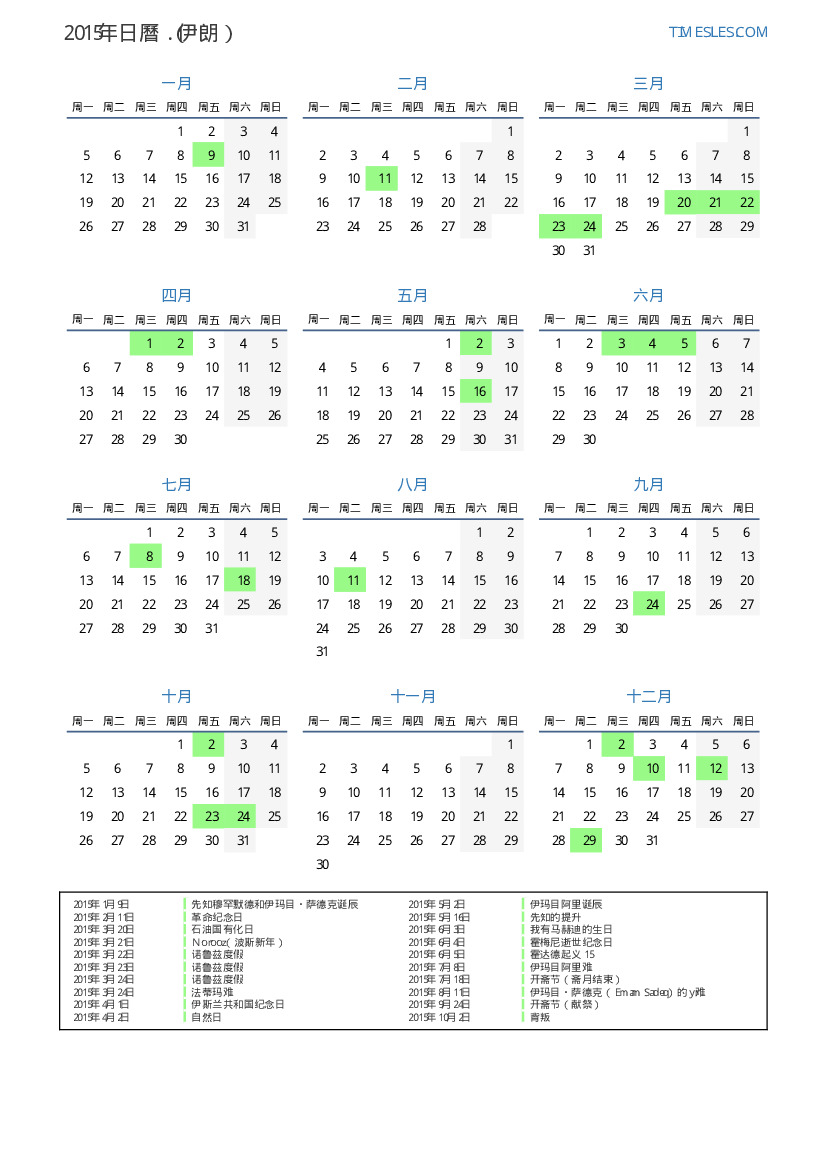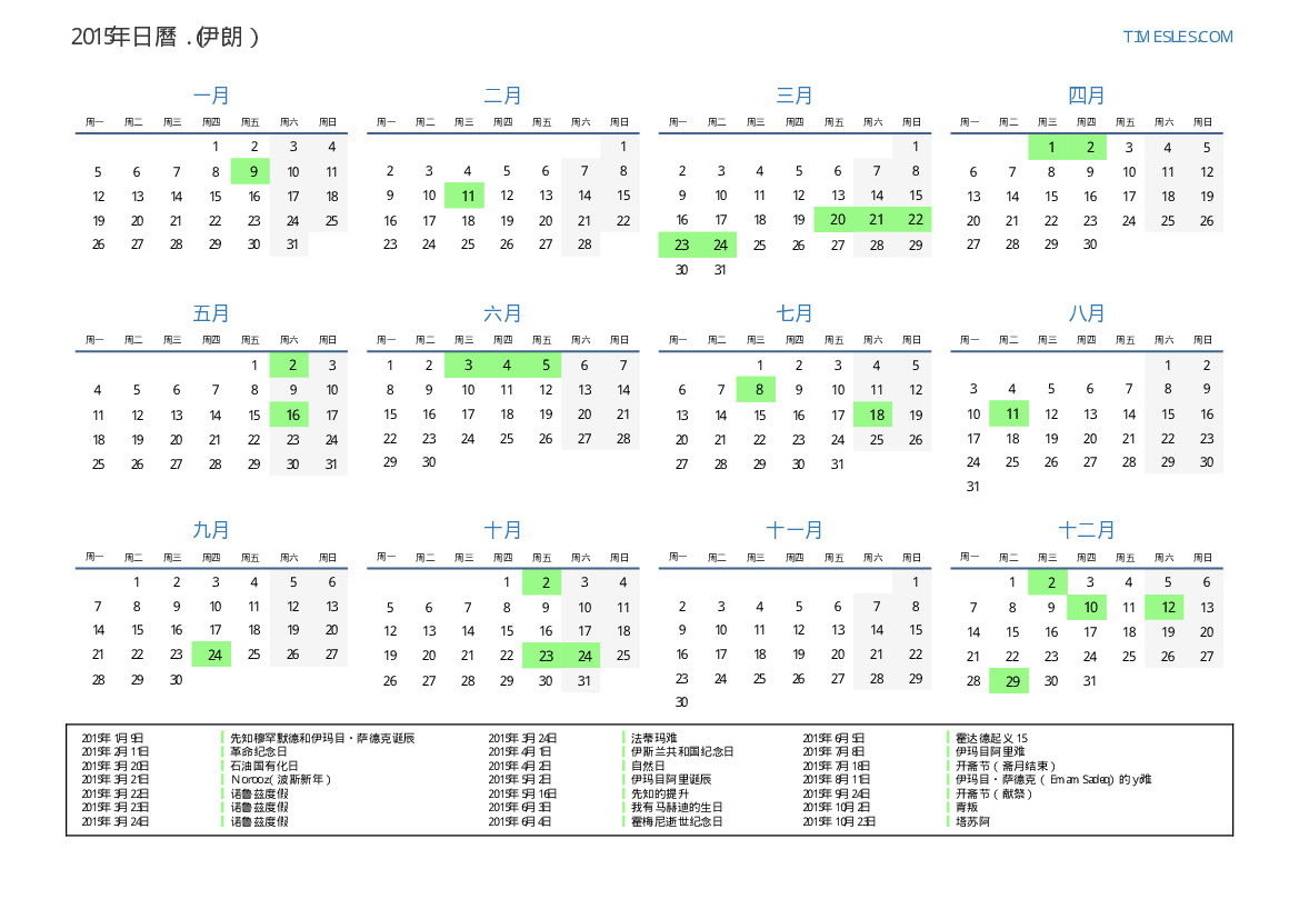 下載並打印2015年伊朗節假日和周末的PDF日曆