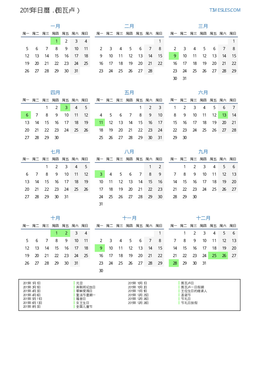 盧薩对于图瓦卢的2015年假期和周末日曆
