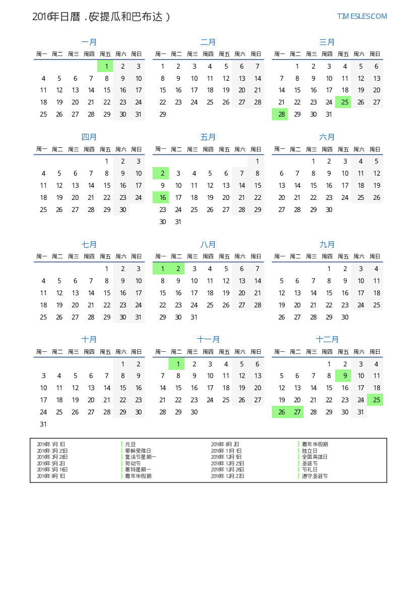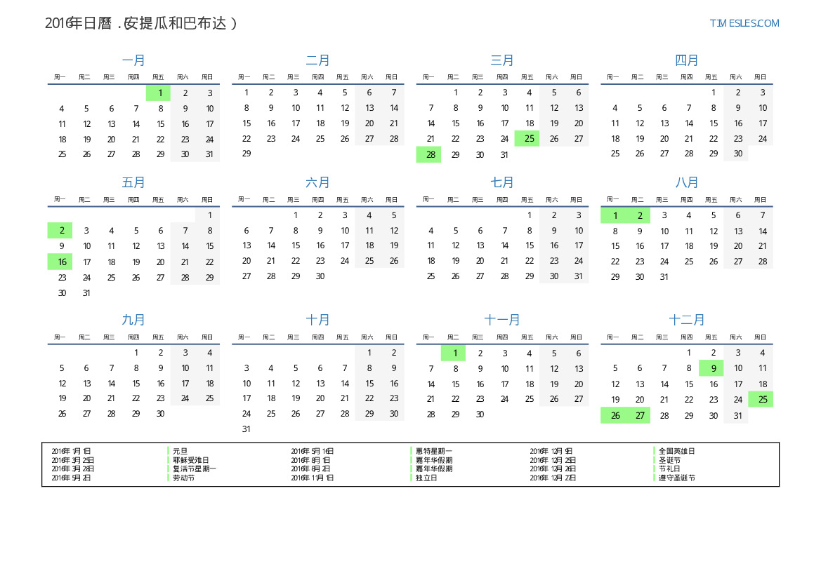 下載並打印2016年安提瓜和巴布达節假日和周末的PDF日曆