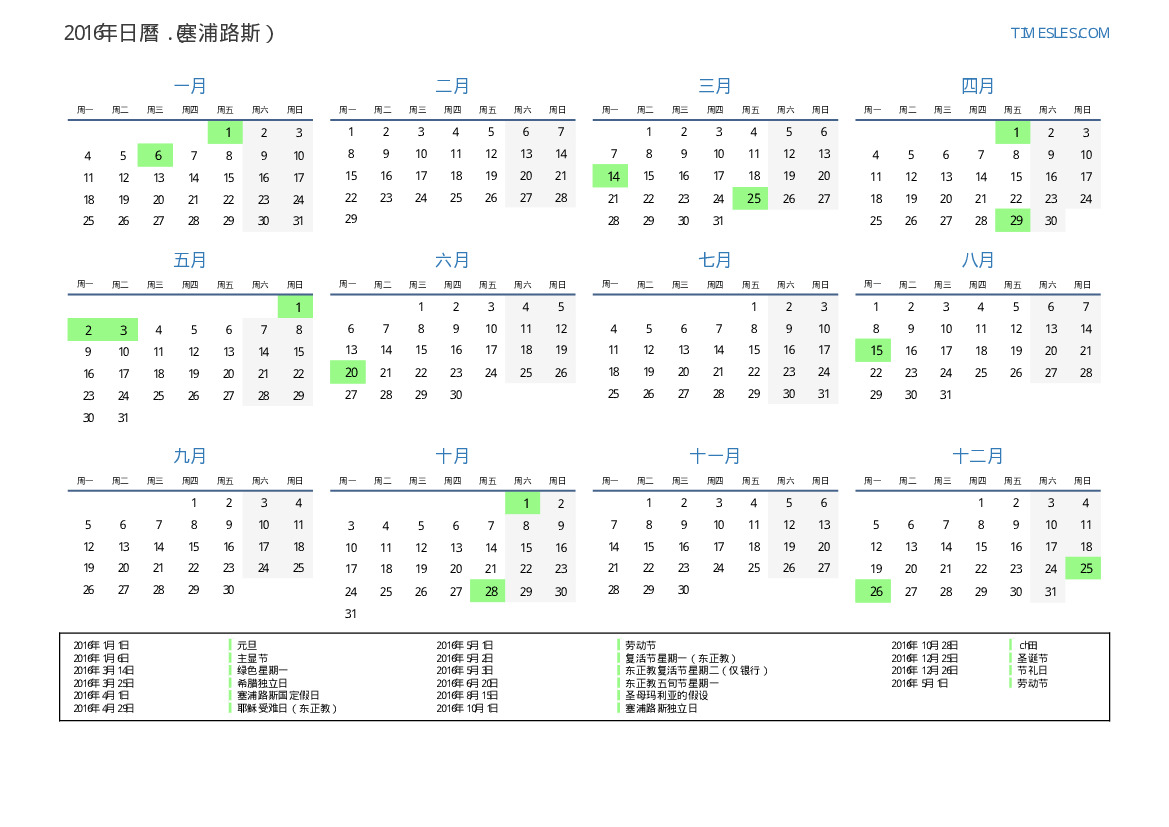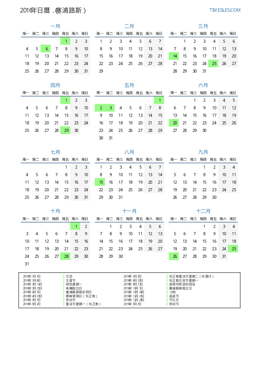 下載並打印2016年塞浦路斯節假日和周末的PDF日曆