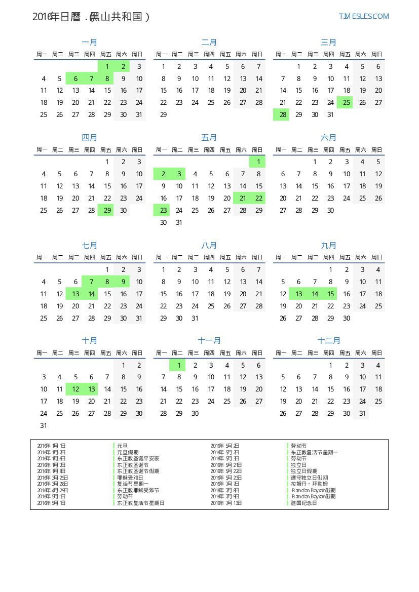 下載並打印2016年黑山共和国節假日和周末的PDF日曆