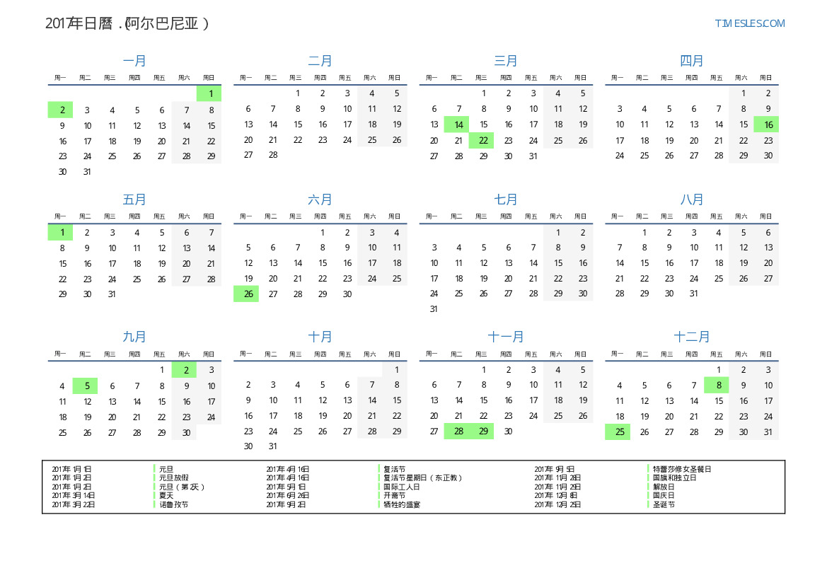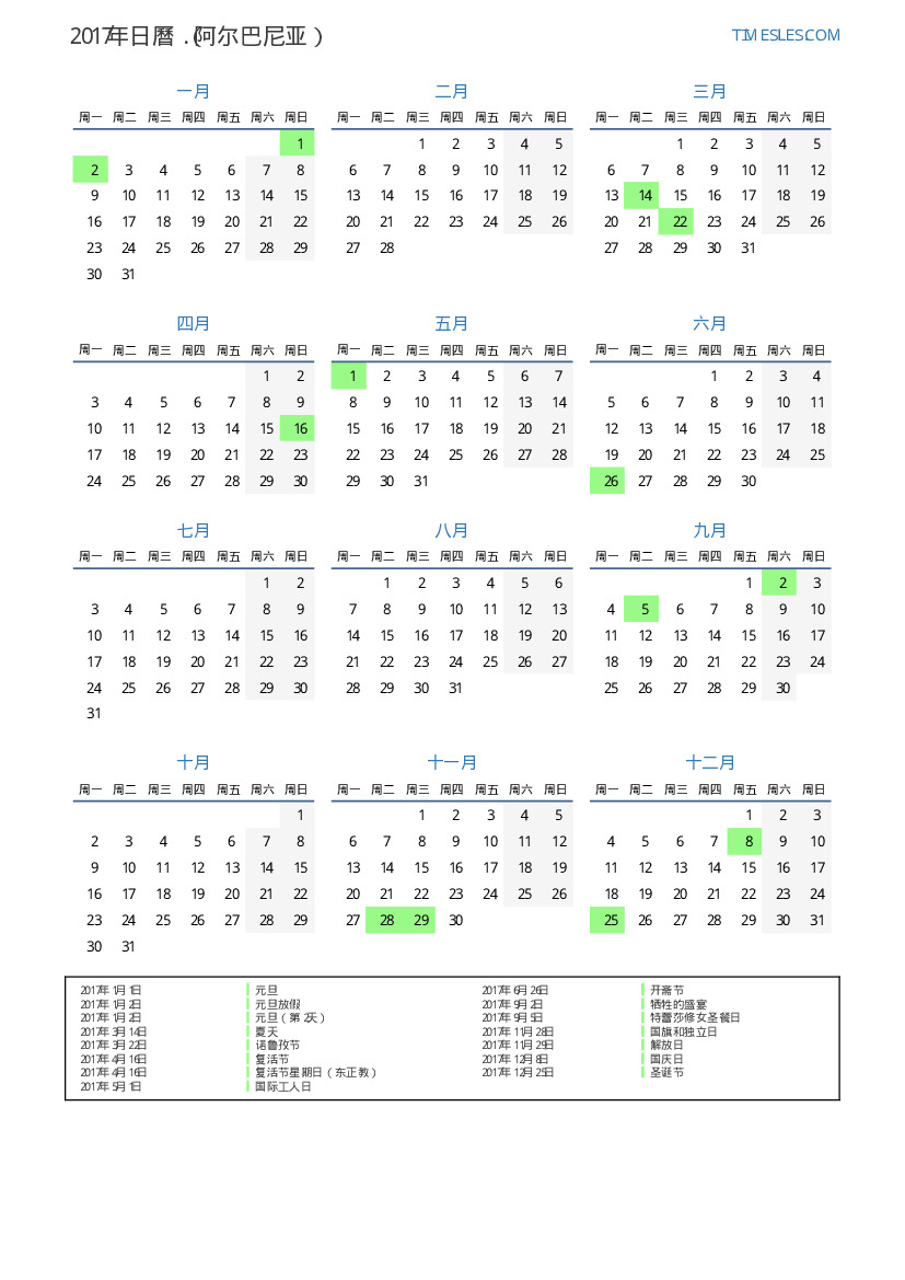 下載並打印2017年阿尔巴尼亚節假日和周末的PDF日曆