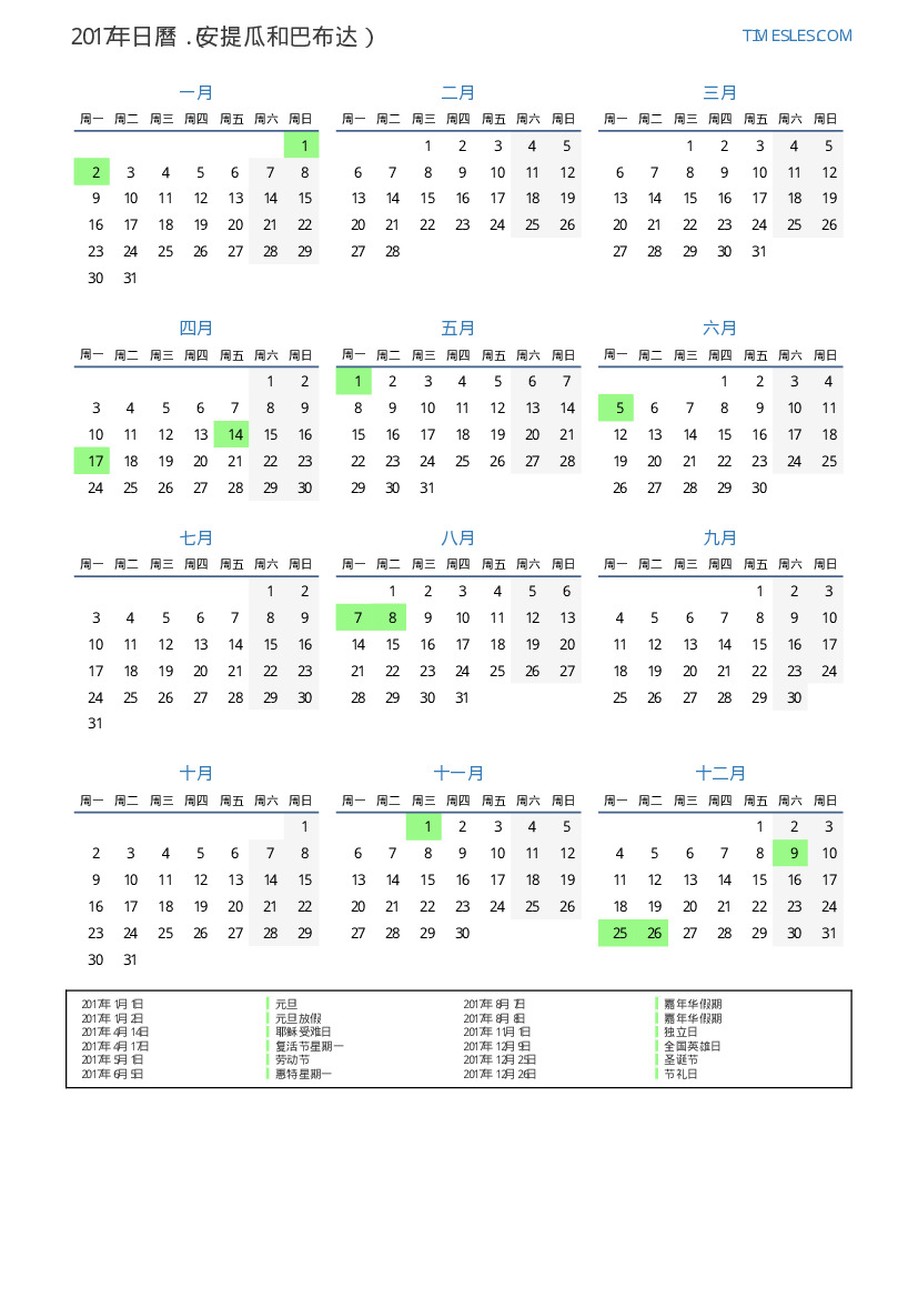 下載並打印2017年安提瓜和巴布达節假日和周末的PDF日曆