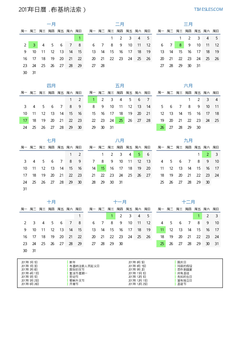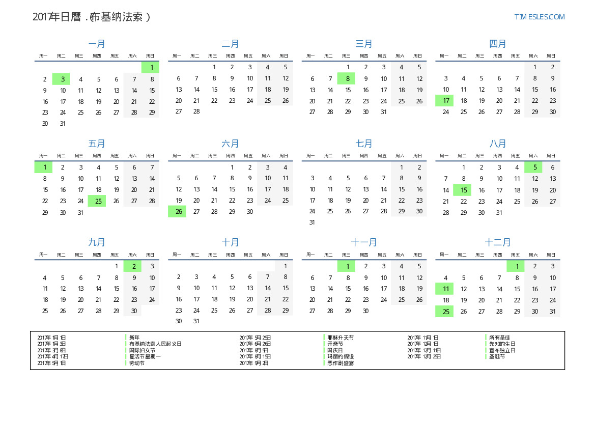 下載並打印2017年布基纳法索節假日和周末的PDF日曆