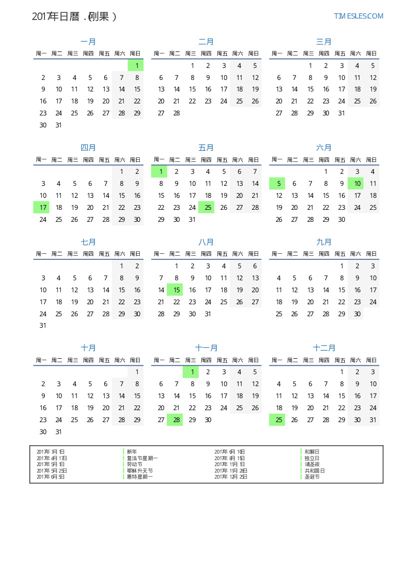 陽曆,不是飛躍年,一年365天。 在2017年,2017有17 假期和休假。 在中國東部的日曆上,2017年公雞年。 一年從在星期天開始,到在星期天結束。