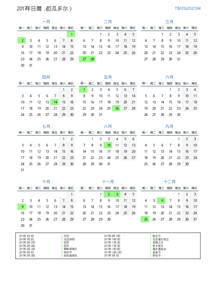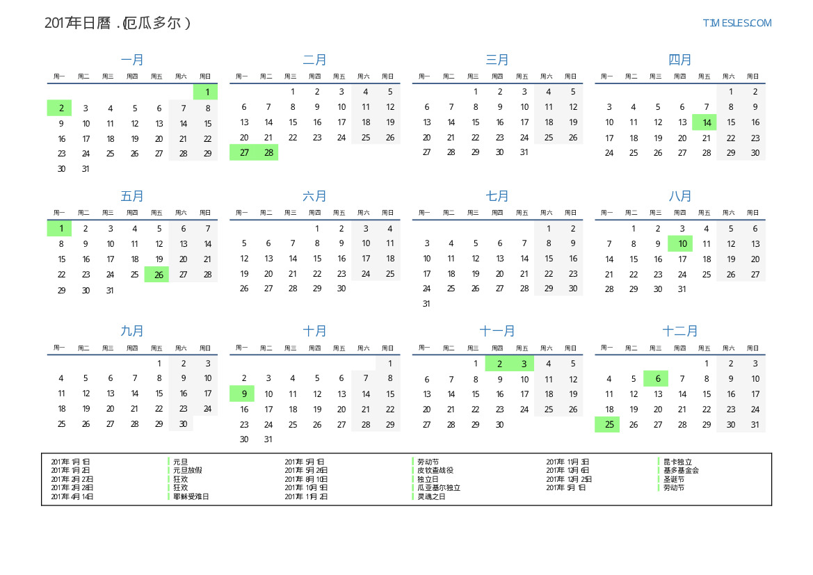 下載並打印2017年厄瓜多尔節假日和周末的PDF日曆