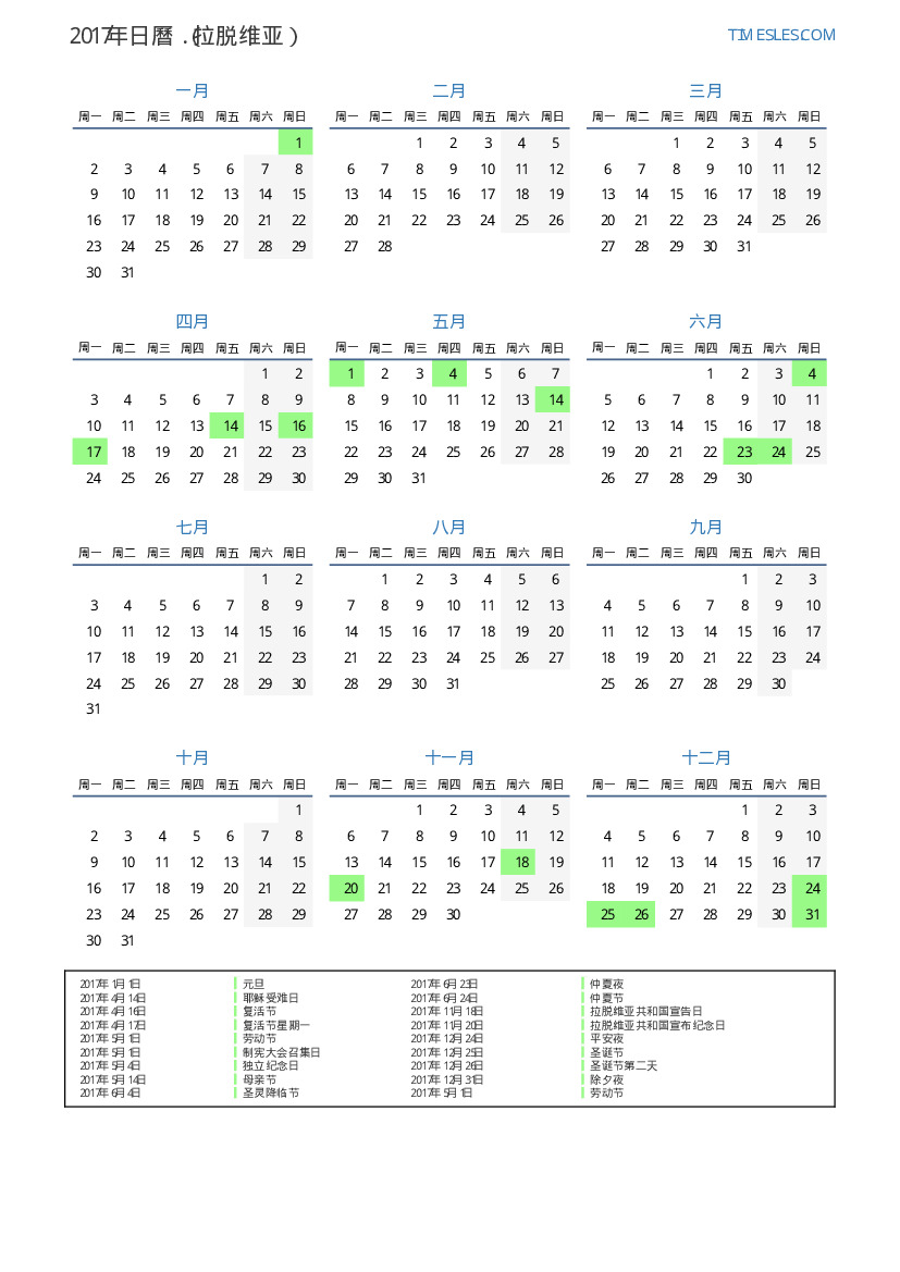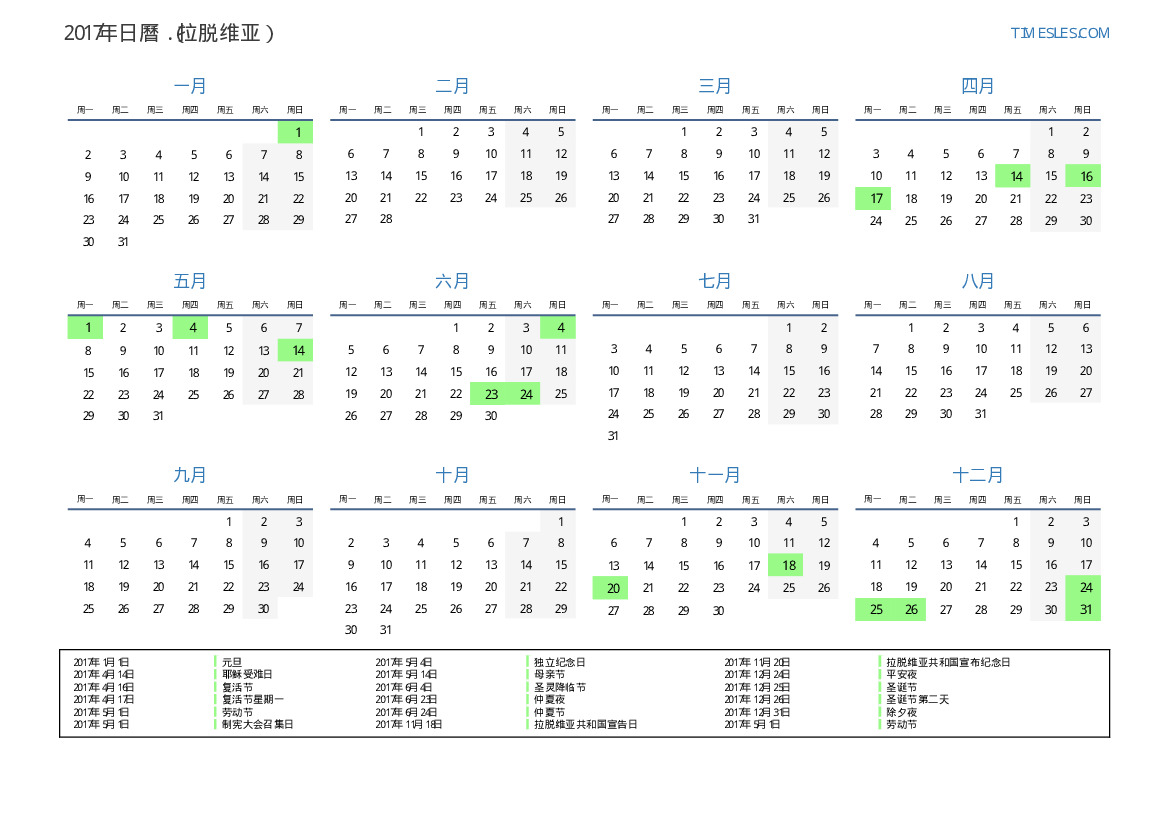 下載並打印2017年拉脱维亚節假日和周末的PDF日曆
