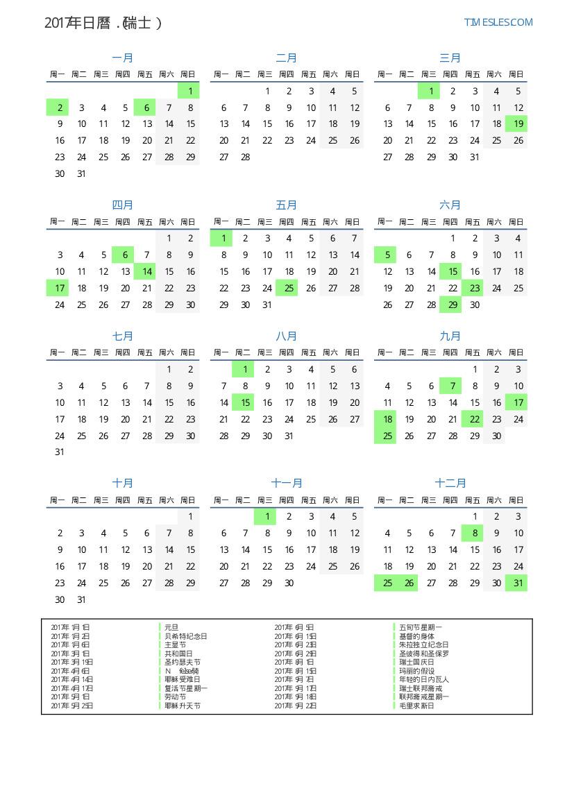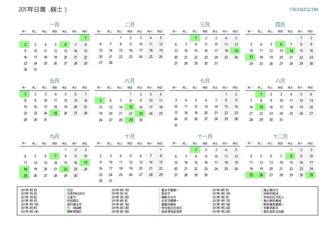 下載並打印2017年瑞士節假日和周末的PDF日曆