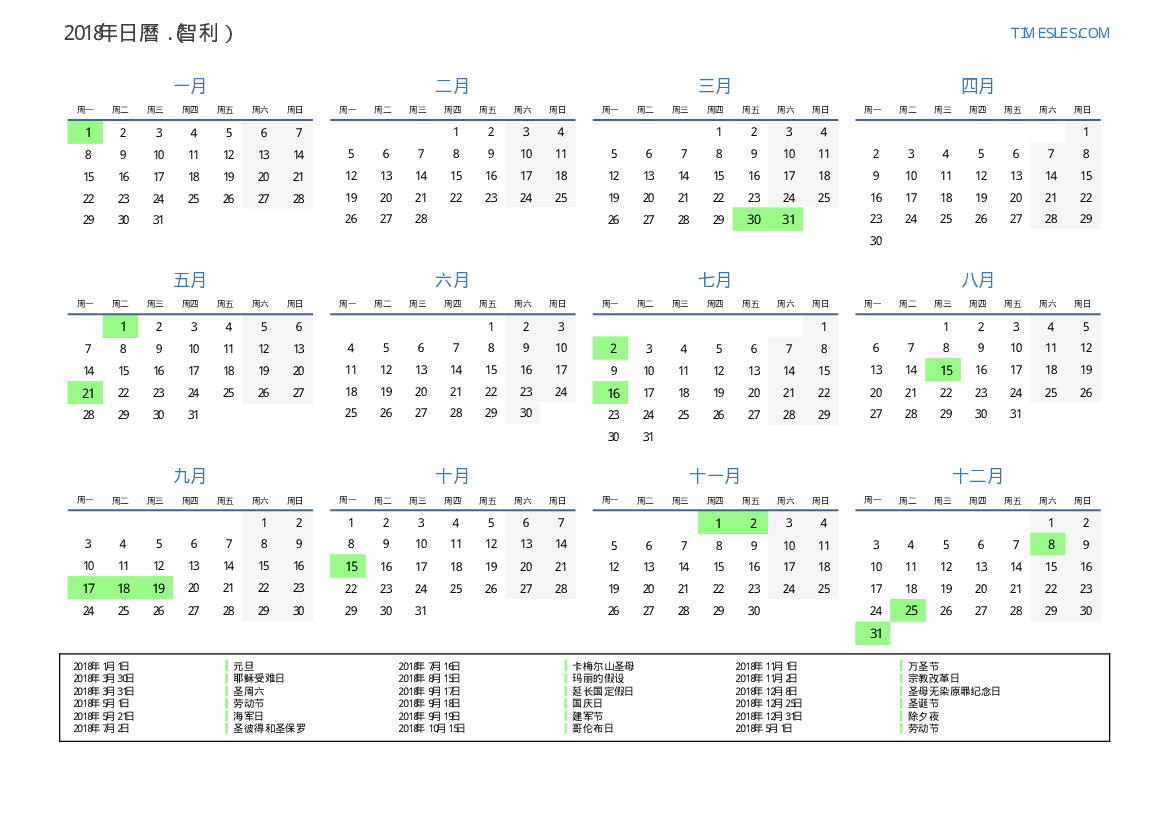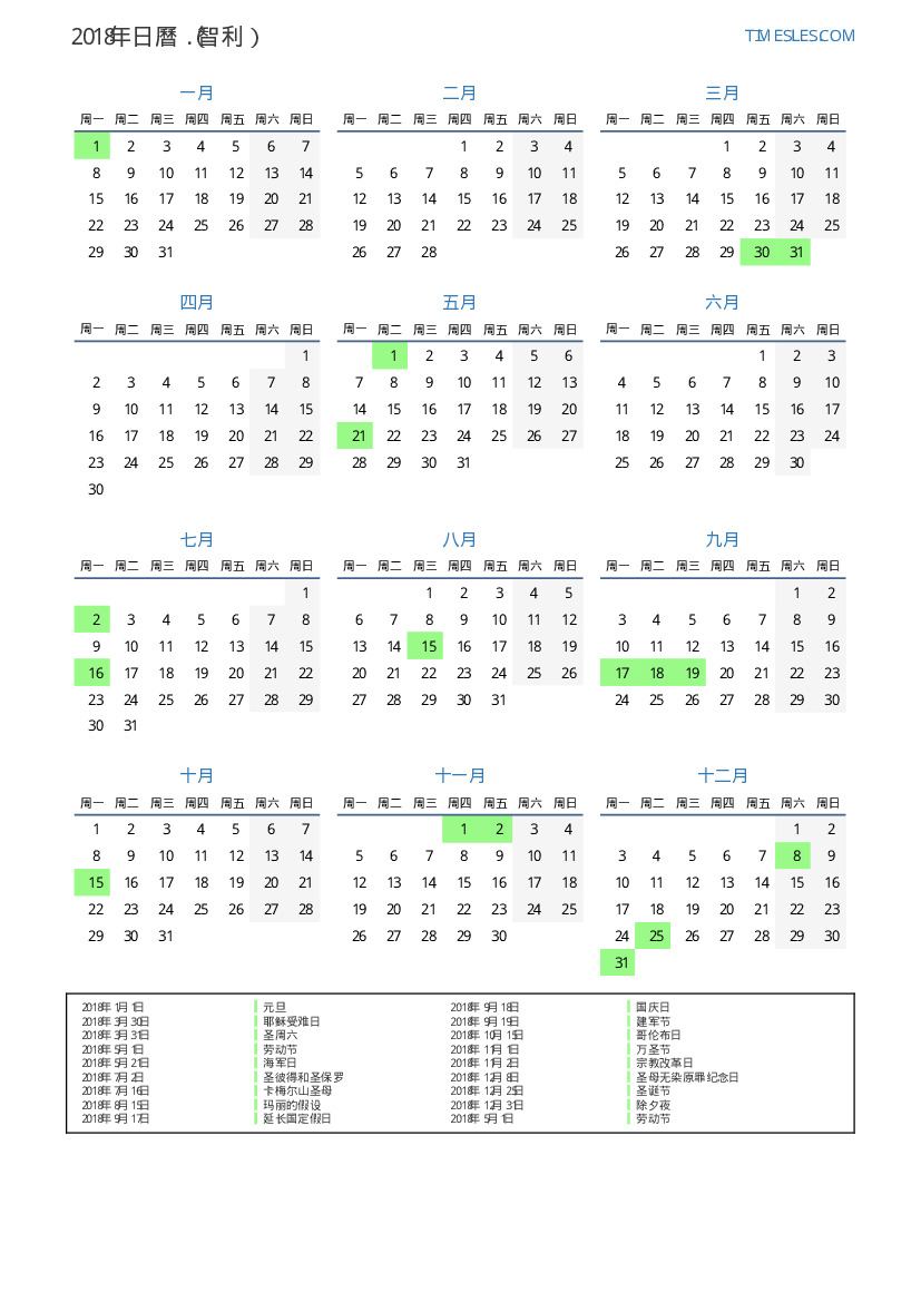 陽曆,不是飛躍年,一年365天。 在2018年,2018有25 假期和休假。 在中國東部的日曆上,2018年狗年。 一年從週一開始,到週一結束。