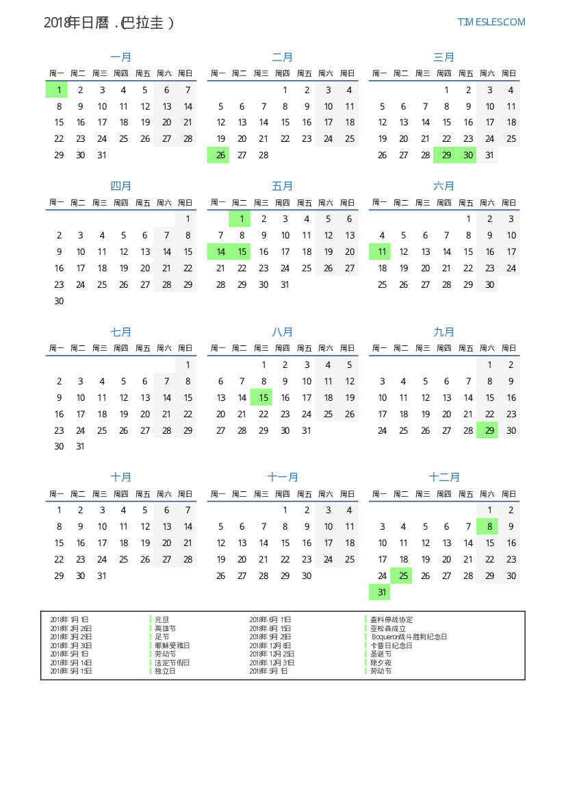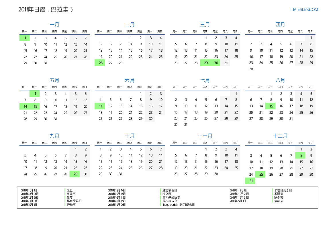下載並打印2018年巴拉圭節假日和周末的PDF日曆