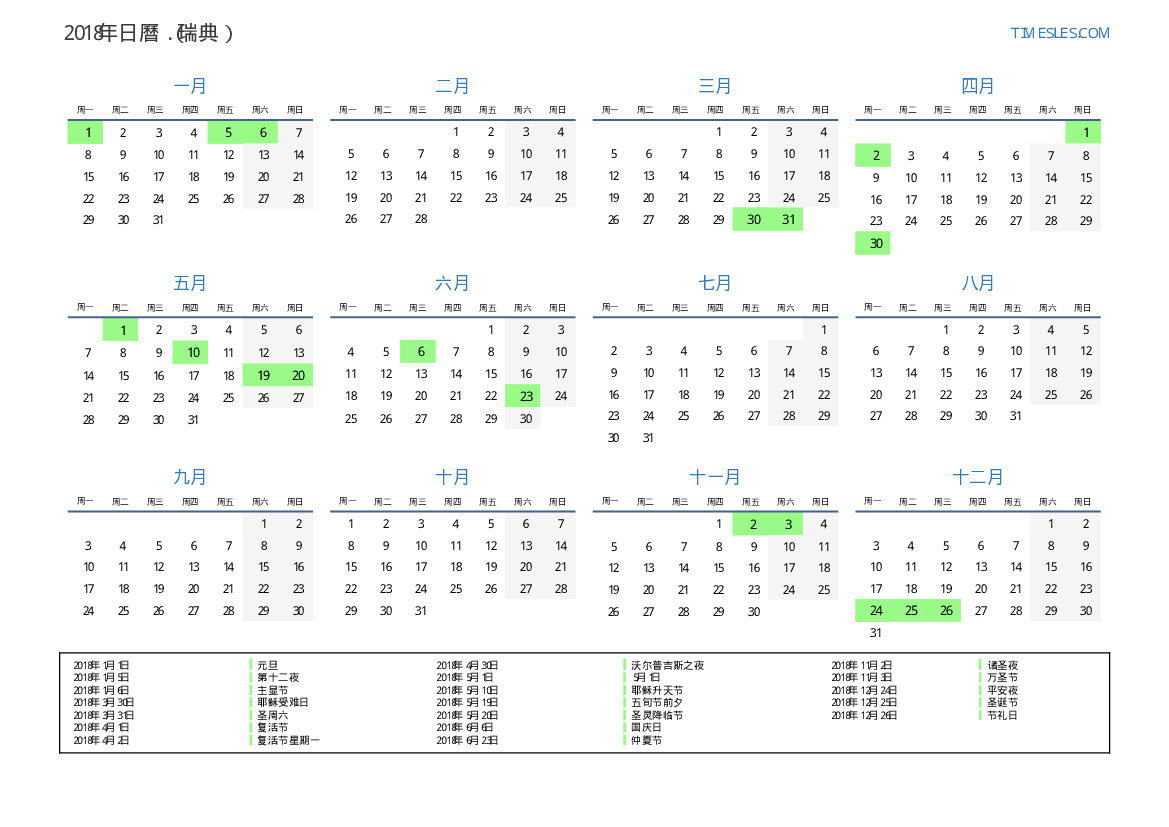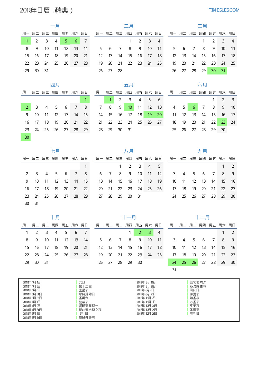 下載並打印2018年瑞典節假日和周末的PDF日曆