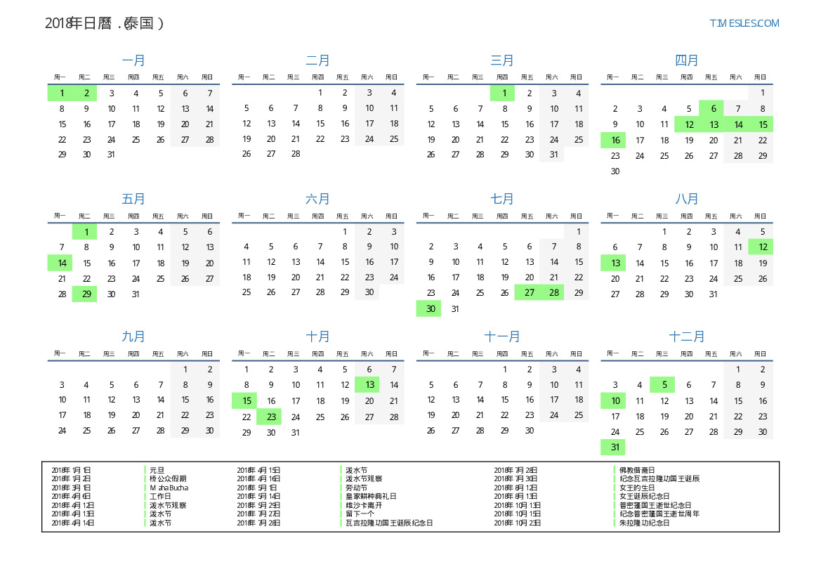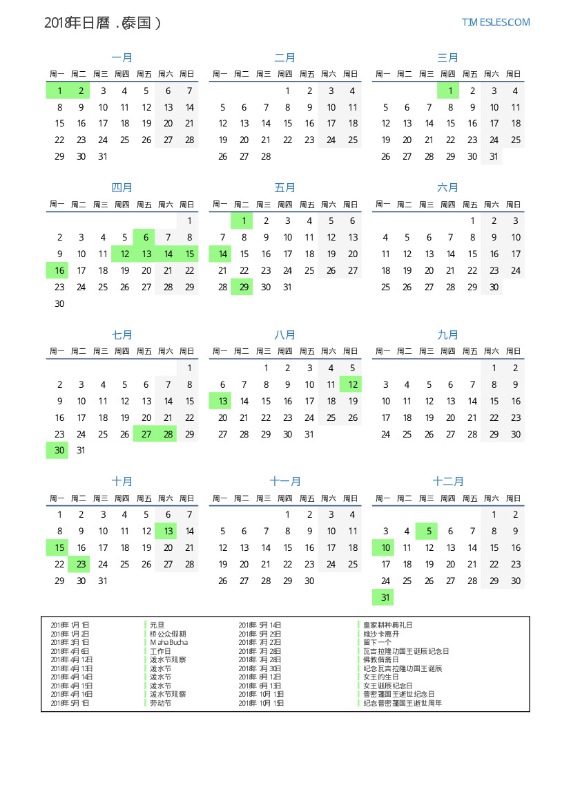 下載並打印2018年为泰国節假日和周末的PDF日曆