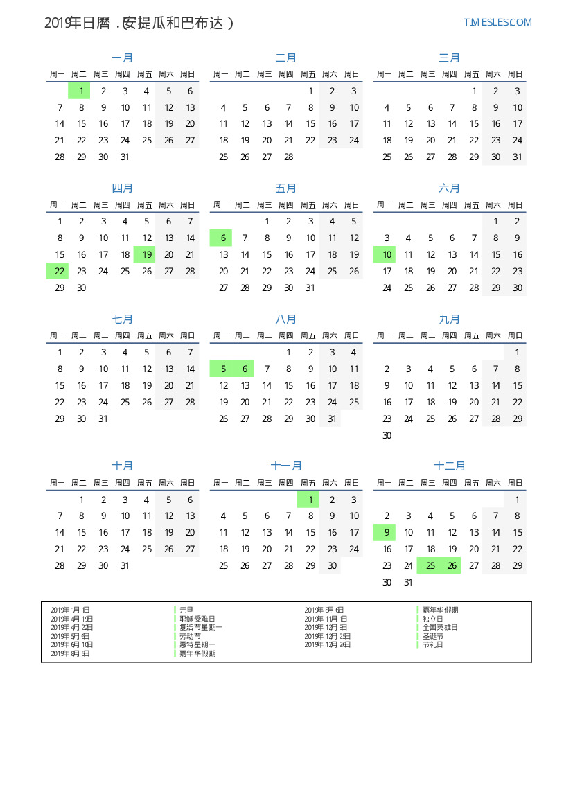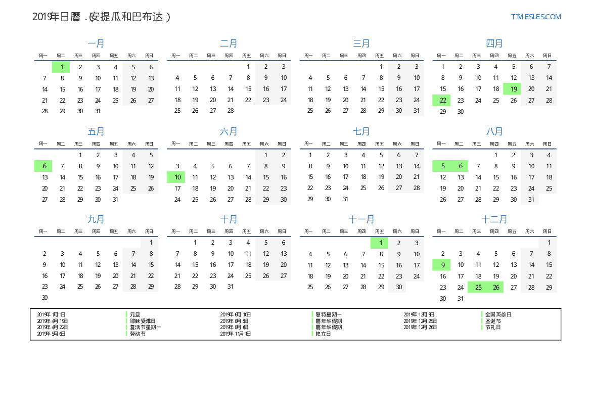 下載並打印2019年安提瓜和巴布达節假日和周末的PDF日曆